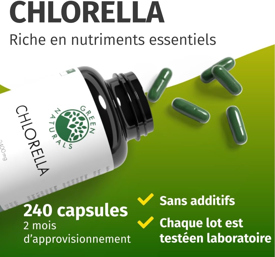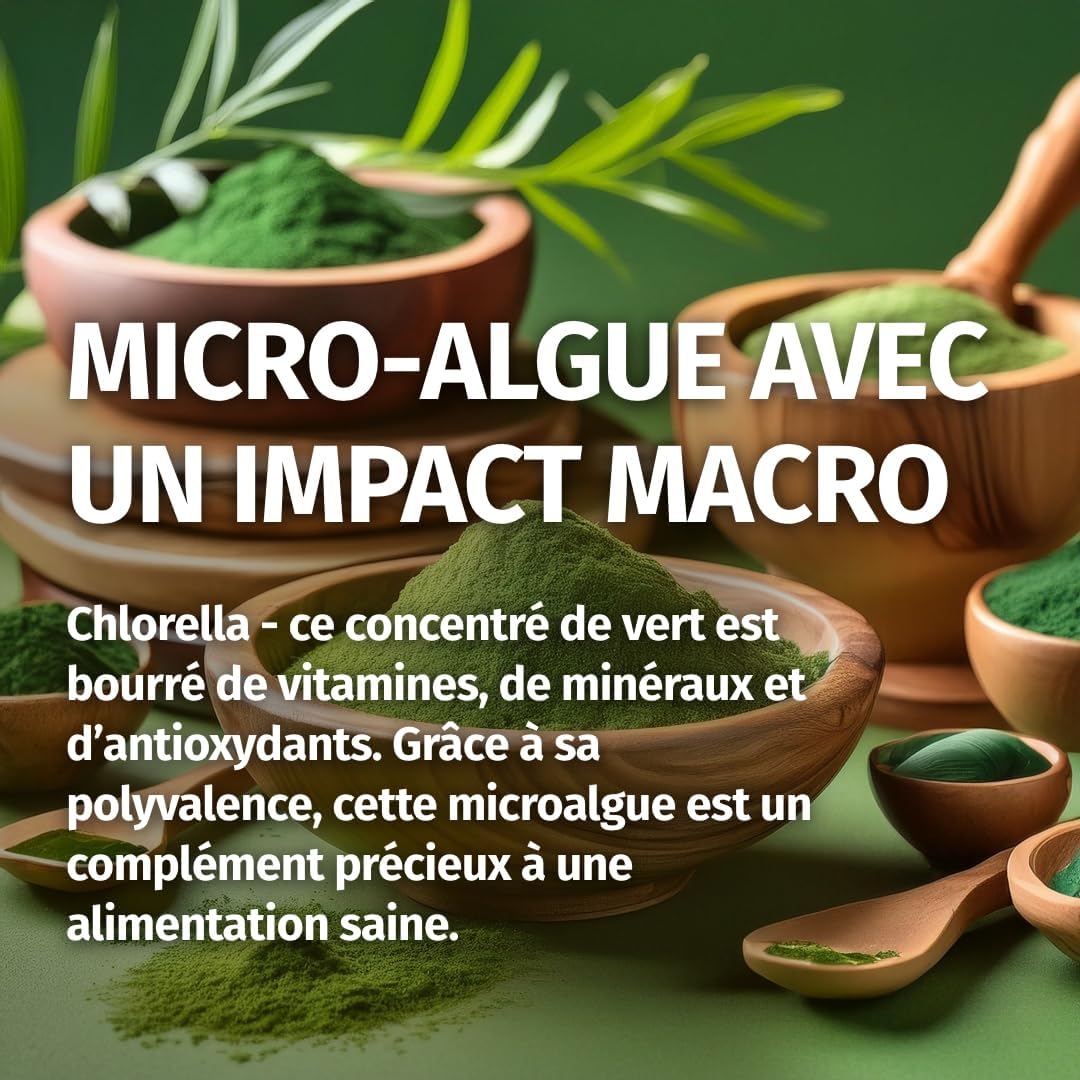 Bouteille noire de complément alimentaire à la chlorelle avec étiquette verte, présentée avec des bols en bois et des feuilles vertes, mettant l'accent sur les bienfaits détoxifiants et tonifiantsBouteille noire de complément alimentaire à la chlorelle avec étiquette verte, présentée avec des bols en bois et des feuilles vertes, mettant l'accent sur les bienfaits détoxifiants et tonifiants