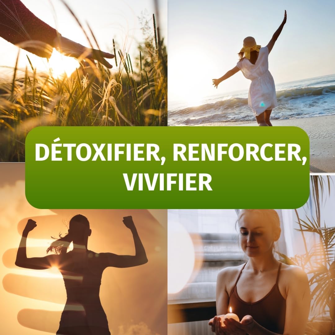de Green Naturals. L'image montre de la poudre verte dans des bols et sur une cuillère en bois. Dose quotidienne de 2400 mg.de Green Naturals. L'image montre de la poudre verte dans des bols et sur une cuillère en bois. Dose quotidienne de 2400 mg.