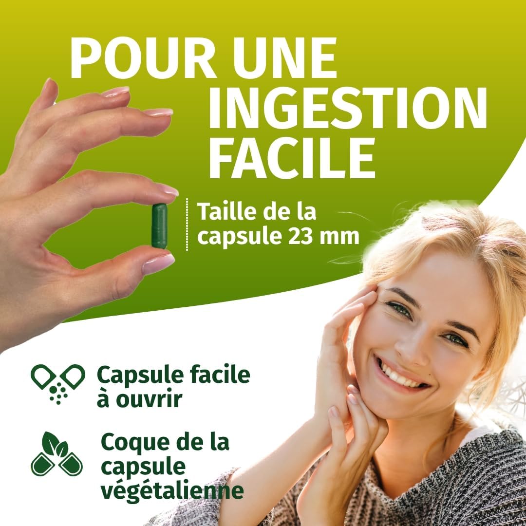 Flacon de supplément vert avec bouchon blanc. Le texte français indique un produit végétarien, hypoallergénique et hautement dosé. Capsules vertes visibles.Flacon de supplément vert avec bouchon blanc. Le texte français indique un produit végétarien, hypoallergénique et hautement dosé. Capsules vertes visibles.