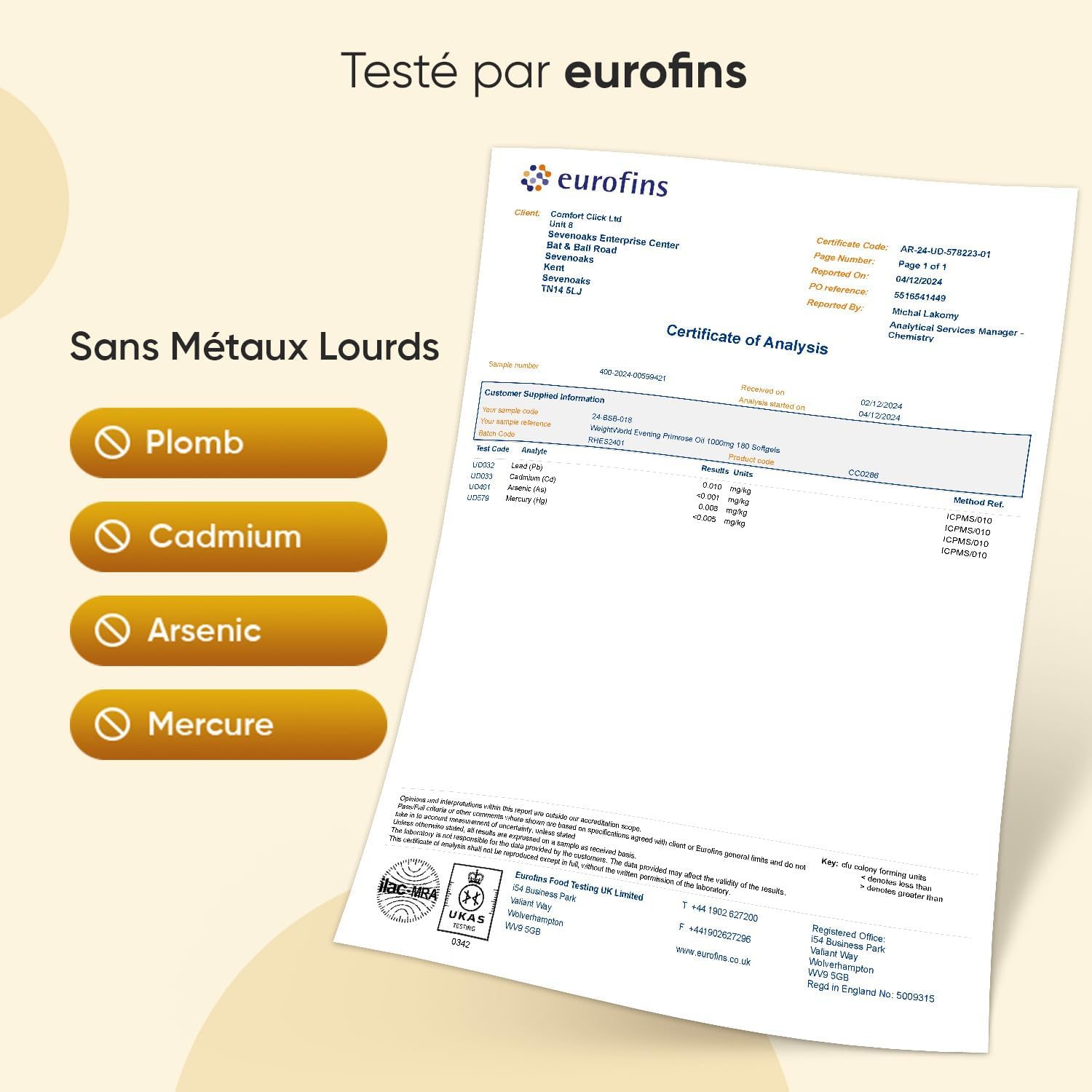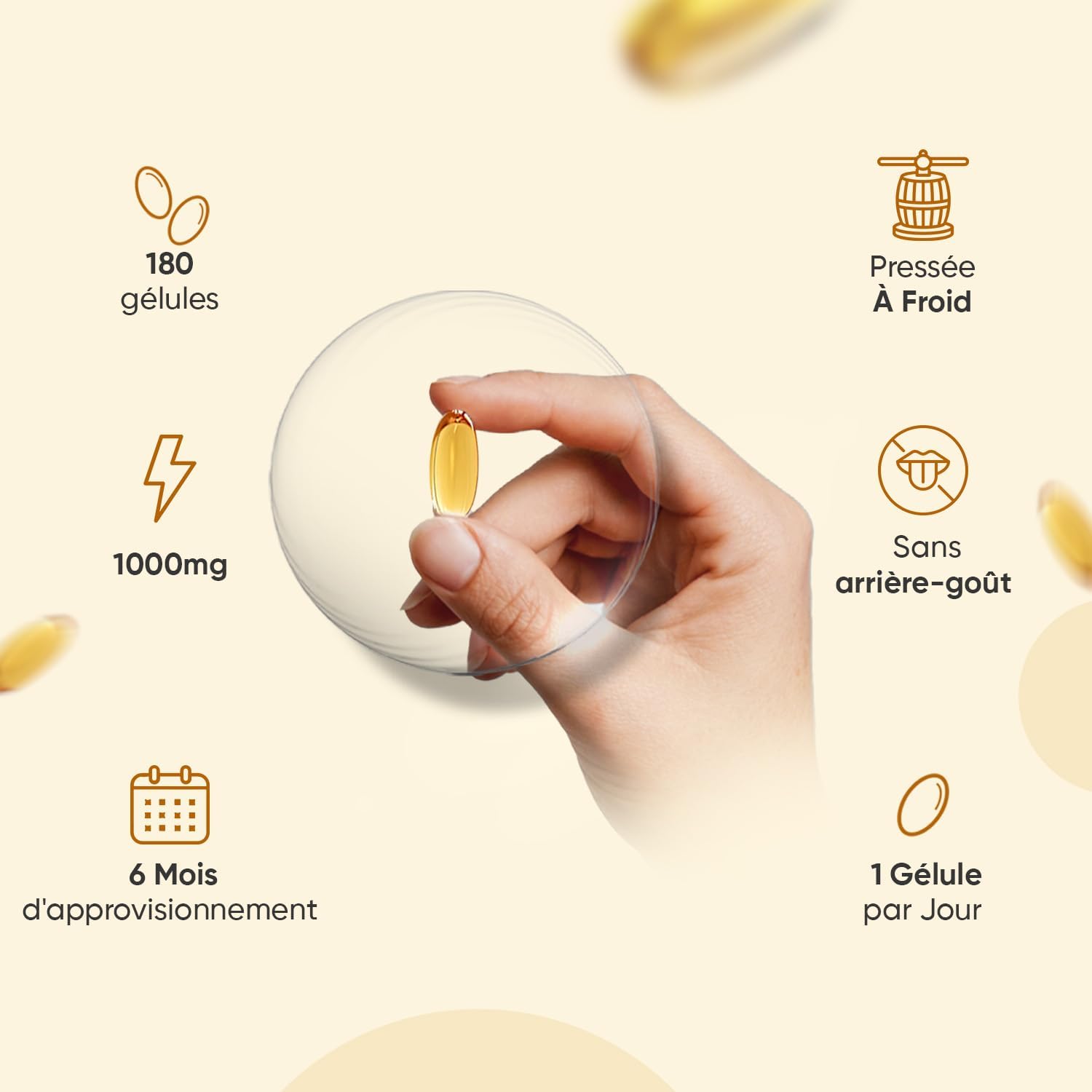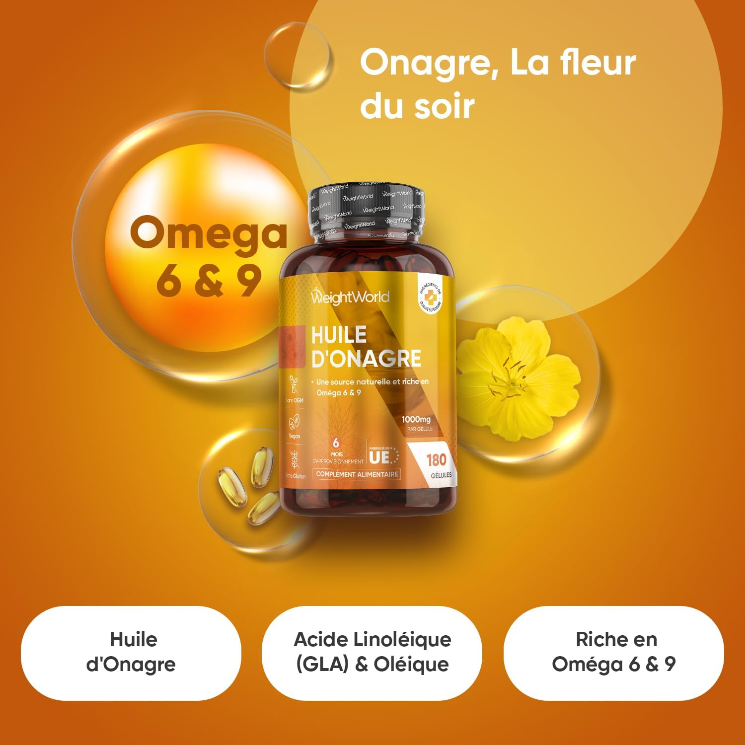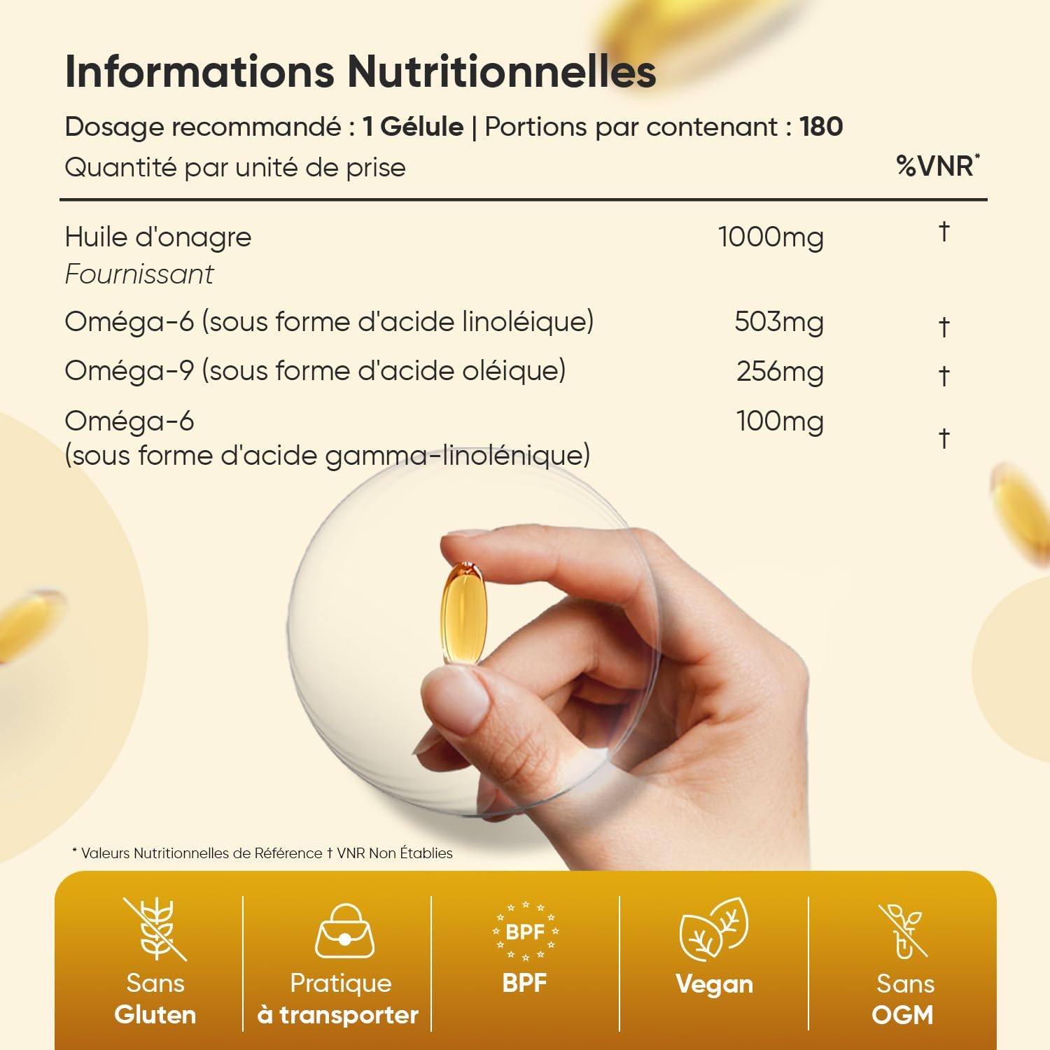 Rich in Omega 6 & 9 – The seeds of the plant Oenothera biennis (evening primrose) contain an oil rich in essential fatty acids: Omega 6, 9 in the form of linoleic acid, oleic acid & gamma-linolenic acid (GLA). A bottle of 180 capsules of evening primrose oil of 1000 mg each allows use for 6 months, at the rate of 1 capsule of evening primrose per day.