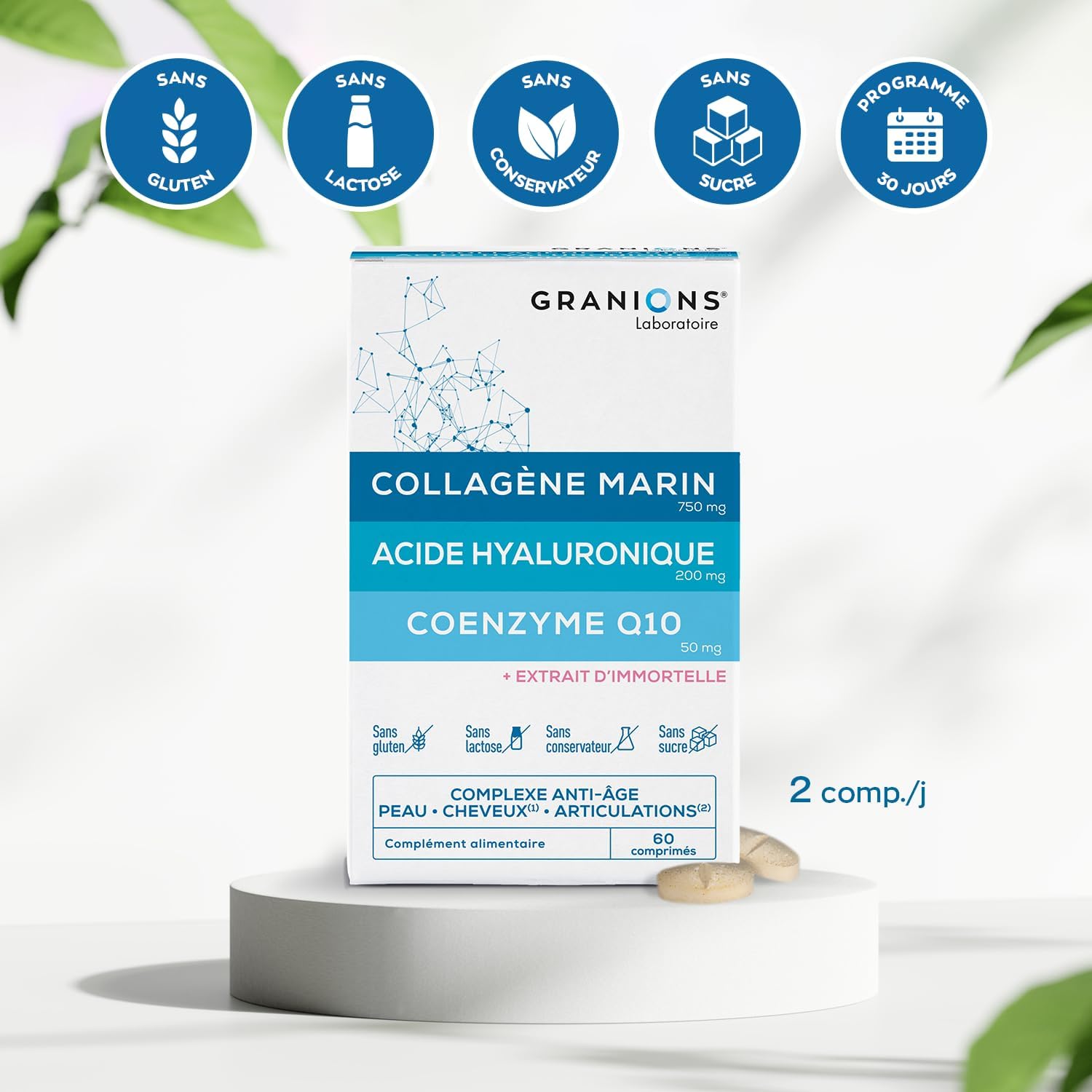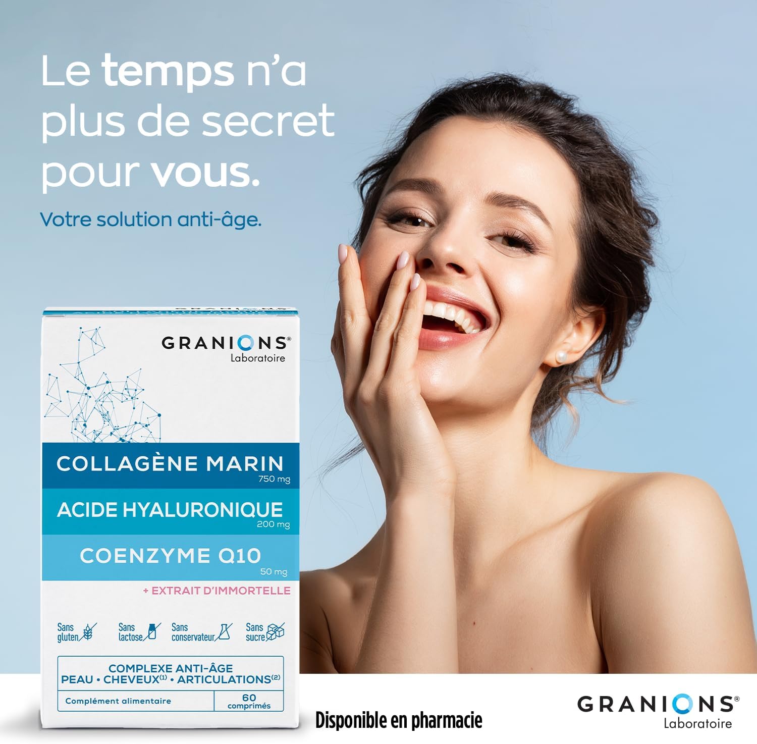 Discover our food supplement with Hyaluronic Acid Marine Collagen and Coenzyme Q10, an anti-aging formula designed to nourish and revitalize the skin from the inside. This complex rich in Marine Collagen ensures firmer skin and visibly reduces wrinkles thanks to the stimulation of natural collagen production. With the addition of Hyaluronic Acid, our GRANIONS product deeply hydrates, plumps and smooths fine lines, while Coenzyme Q10 promotes cell regeneration for complete anti-aging action. Marine Collagene, present in high concentration, works in synergy with Hyaluronic Acid to clarify the complexion and reduce blemishes, including acne. Coenzyme Q10, added to this powerful combination, supports cellular energy and protects the skin from external aggressions. Together, these active ingredients, Marine Collagen, Hyaluronic Acid and Coenzyme Q10 contribute to a visibly younger-looking glowing skin. By regularly taking this supplement of Marine Collagene, enriched with Hyaluronic Acid and Coenzyme Q10, you offer your skin optimal nutrition, reduce the signs of aging and preserve a radiant appearance. The collagen peptides included in our formula ensure effective absorption, enhancing the benefits of Marine Collagene, Hyaluronic Acid, and Coenzyme Q10 for visible results. In addition, manganese and selenium are essential for skin health, contributing to its protection against oxidative damage and maintaining its structure. Our supplement is ideal for those looking to improve their skin health, providing a convenient and effective solution to incorporate these essential nutrients into your daily routine. With regular intake, Marine Collagene, Hyaluronic Acid, and Coenzyme Q10 work together to keep your skin soft, supple and youthful.