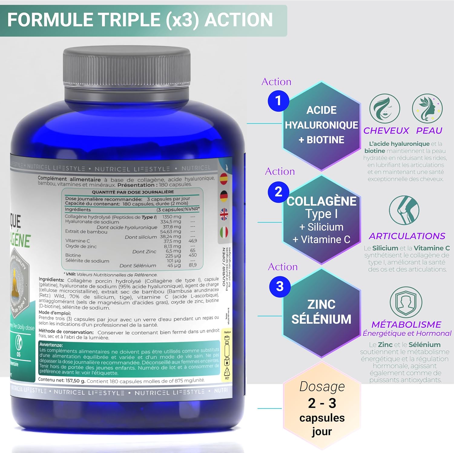 Collagen and Hyaluronic Acid: Hydrolyzed Collagen + Hyaluronic Acid + Biotin with Zinc, Selenium, Natural Vitamin C, Bamboo Extract – Food Supplement – 180 Capsules – 3 Months