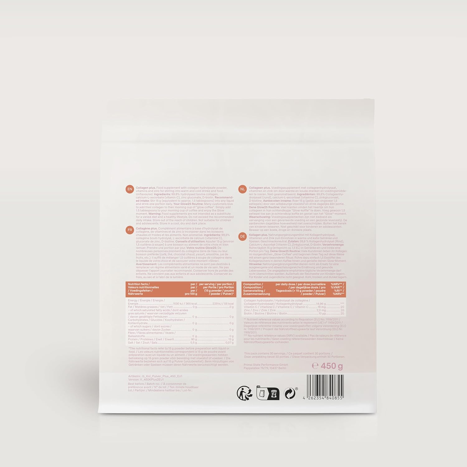 Collagen Plus [450g] – Glow25 – with Vitamin C, Zinc and Biotin – Premium Collagen Hydrolysate – Type 1 & 3 Peptides – High Solubility