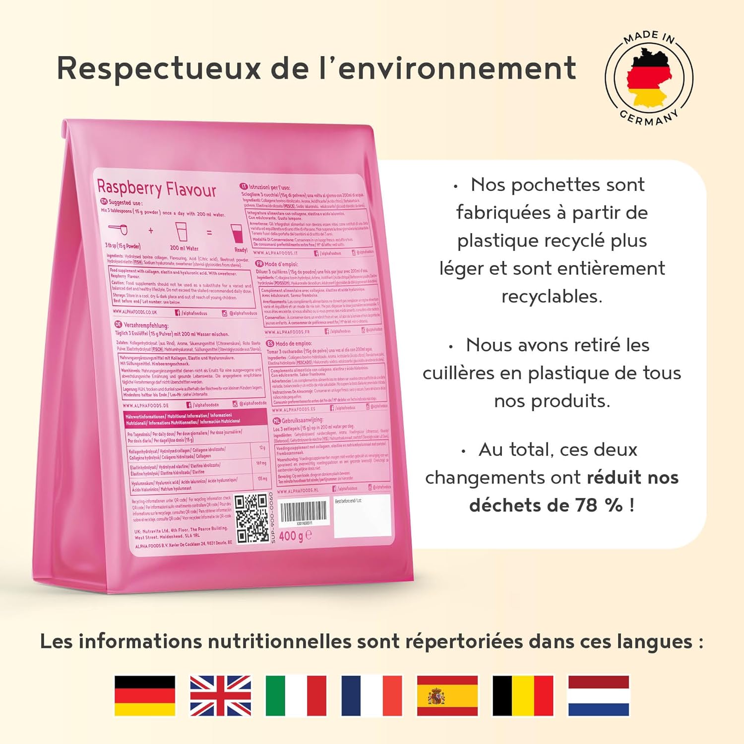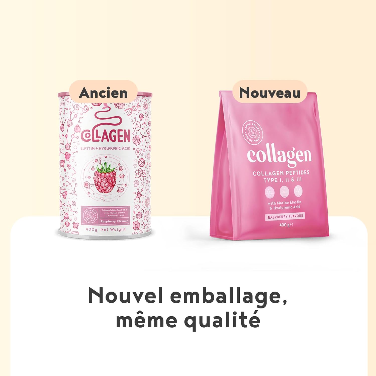 Collagen Powder [400g] | Collagen Peptides (Type I, II & III) | Marine Elastin + Hyaluronic Acid | Hydrolyzed Collagen Powder | Raspberry Flavour | Alpha Foods