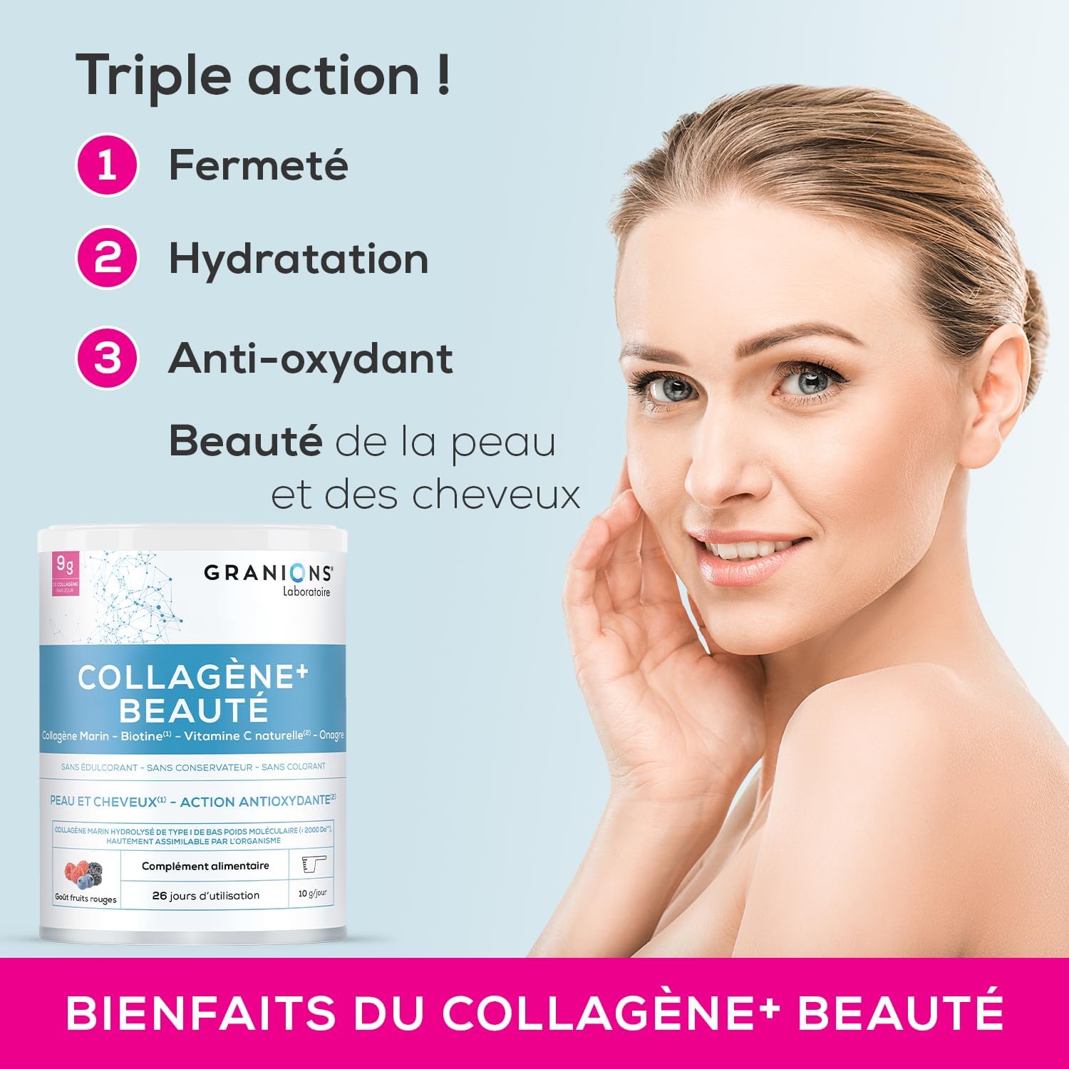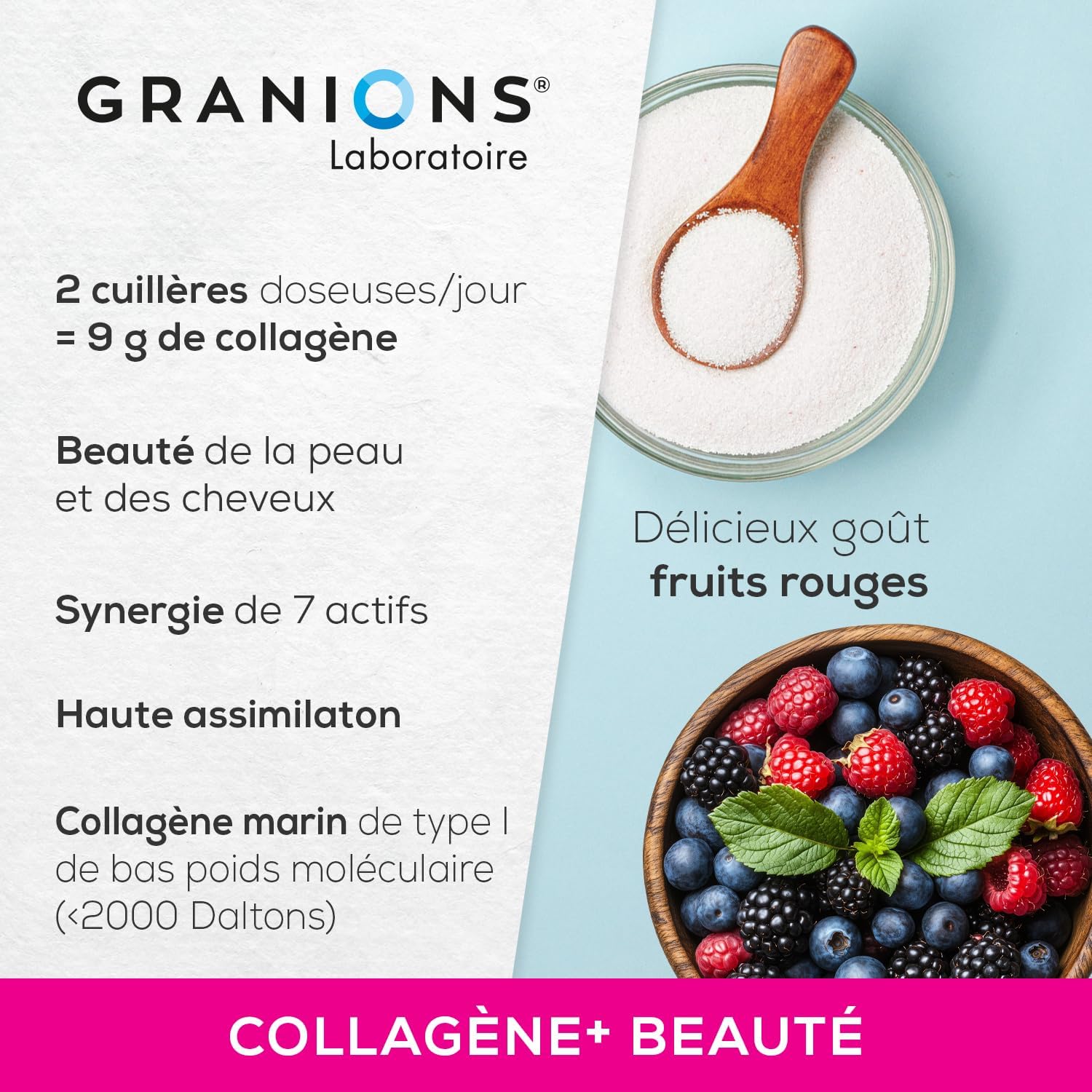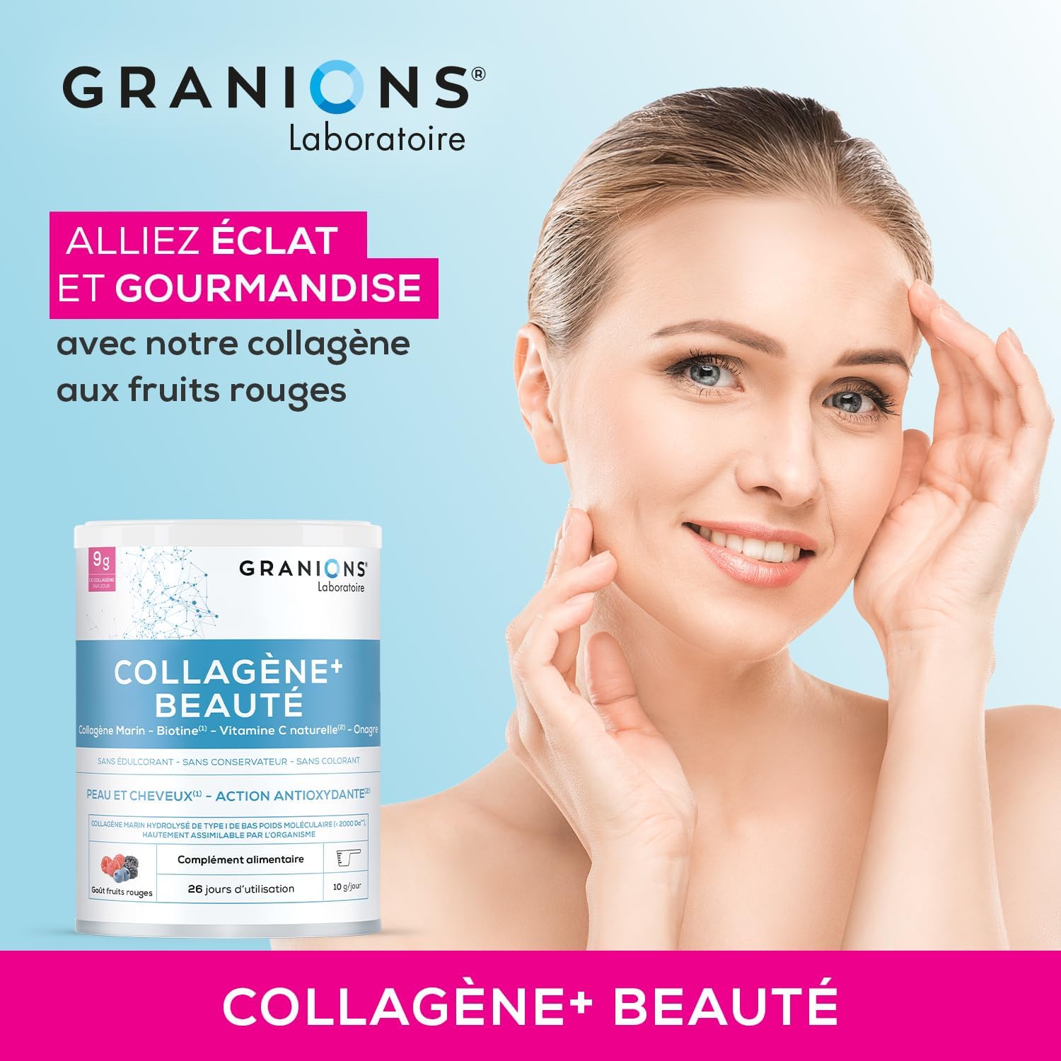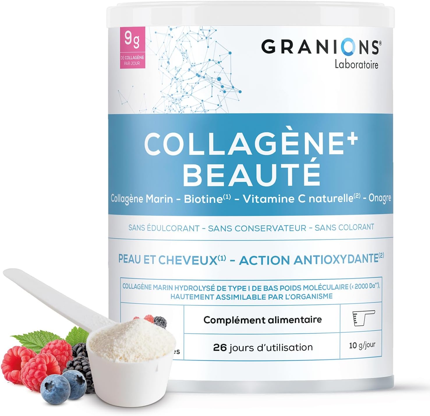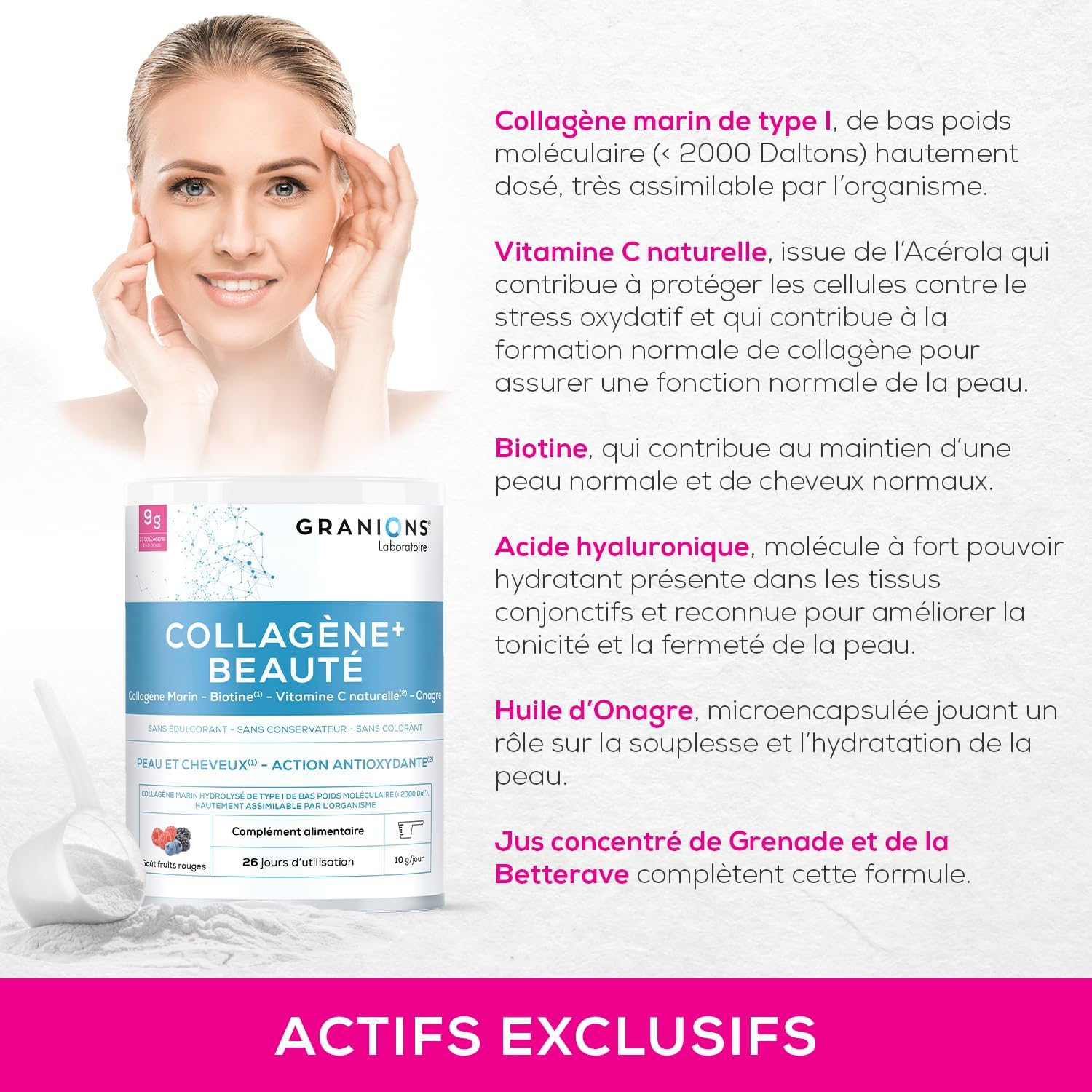 Discover our nutritional supplement Collagene Marin Beauté+, Collagen Powder Red Fruits, a formula enriched with hydrolyzed marine collagen, hyaluronic acid, hair biotin, vitamin C and evening primrose oil, for a complete action on the beauty of skin and hair. From the age of 25, natural collagen production decreases by 1% each year, which is why an intake of marine collagen is essential to maintain hydration and firmness of the skin. Our Granions Laboratory has created this marine collagen powder, a high quality product, containing 9 g of hydrolyzed marine collagen per dose. This synergistic formula, combining collagen and hyaluronic acid, as well as hair biotin, supports very fast hair growth while improving elasticity and skin tone. With this hair food supplement, find beautiful skin and strengthened hair thanks to the combined benefits of marine collagen, vitamin C and biotin chevex. In addition to hydrolyzed marine collagen, this formula contains natural vitamin C, derived from acerola, which protects cells against oxidative stress and promotes normal collagen formation, essential for healthy and glowing skin. The presence of biotin hair contributes to the maintenance of normal hair, while encapsulated evening primrose oil helps to deeply nourish the skin. Easy to use, just dissolve 2 measuring spoons of marine collagen powder in 200ml of water or fruit juice to enjoy a beauty solution to incorporate daily into your routine. Each 260g jar of marine collagen provides a 26-day cure for optimal effects on the beauty of your skin and hair. The Granions brand, leader in collagen in France, guarantees laboratory-tested marine collagen without sweeteners, preservatives or dyes.