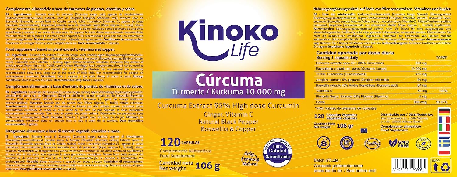 PREMIUM FORMULA: Based on CONCENTRATED EXTRACT (95%) with pure curcumin, the active ingredient of turmeric root. A total of 10,000 mg of plant, the largest on the market. With black pepper extract (at 95% piperine concentration), Vitanima C and copper that guarantees the bioavailability and maximum absorption of curcumin (curcuminoids). One capsule of our turmeric is equivalent to 20 capsules of another powdered turmeric or organic curcumin.
