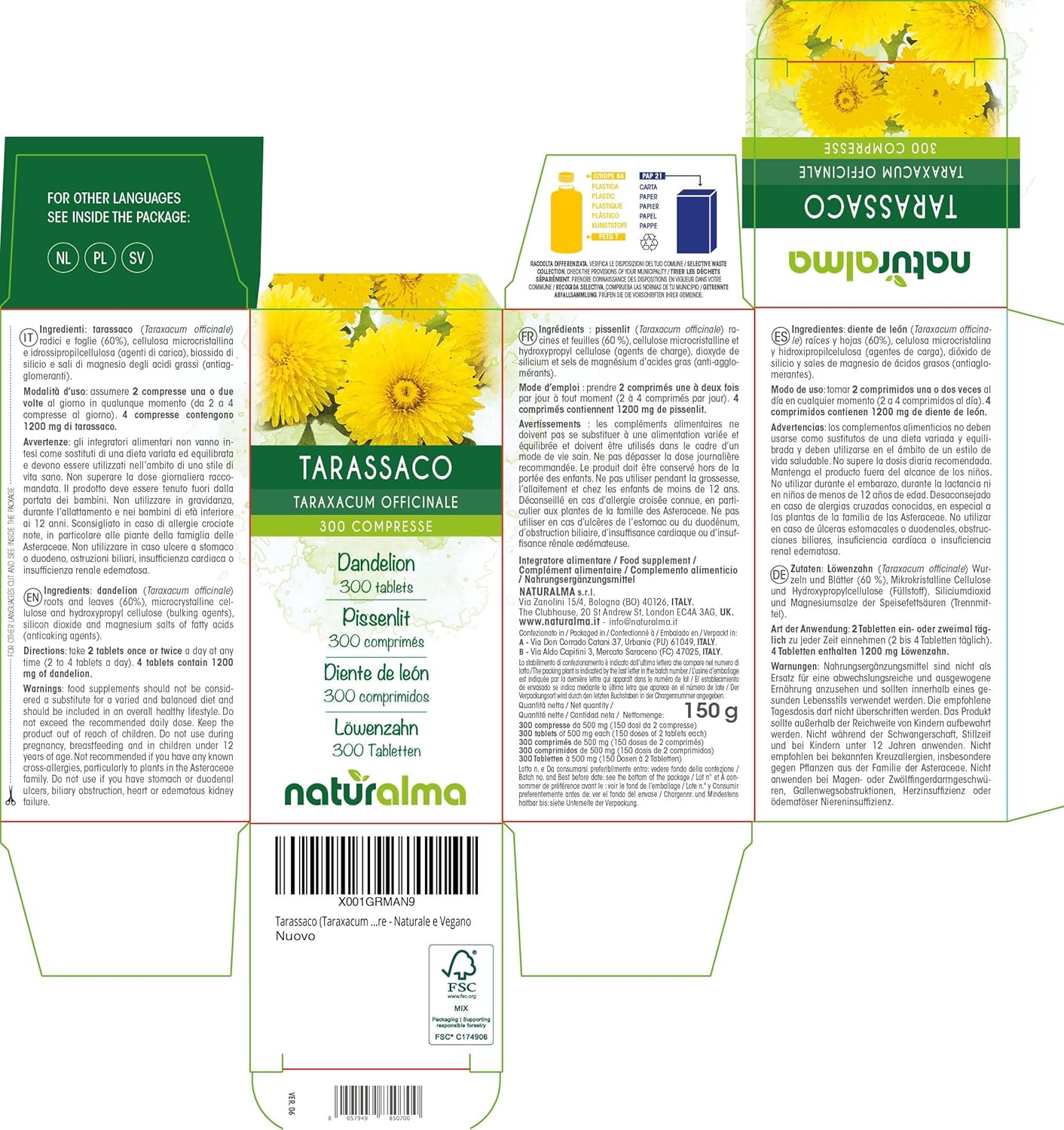 Be the first to review “Dandelion (Taraxacum officinale) roots and leaves Naturalma – 150 g – 300 tablets – Food supplement – Natural and Vegan” Cancel reply