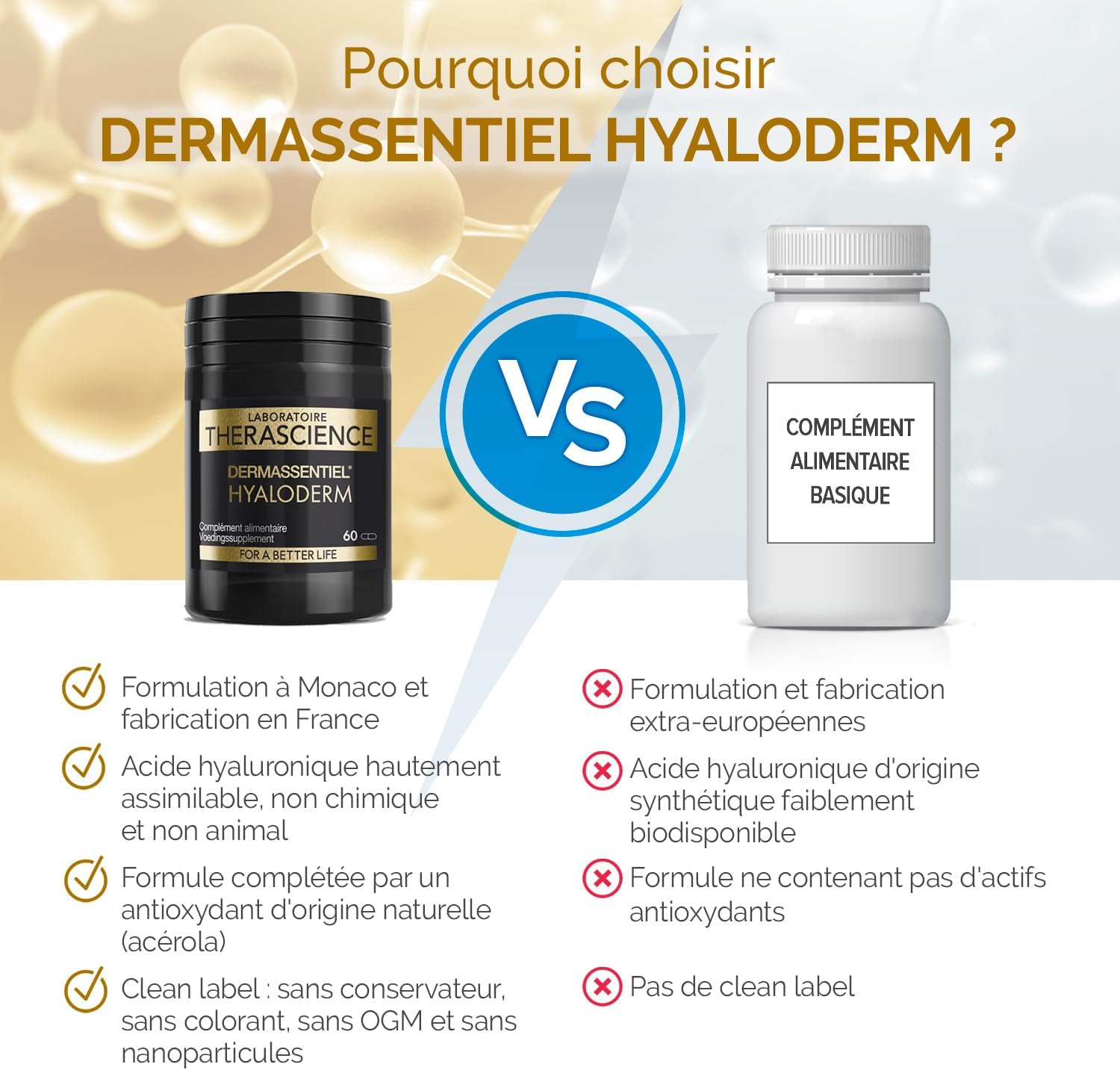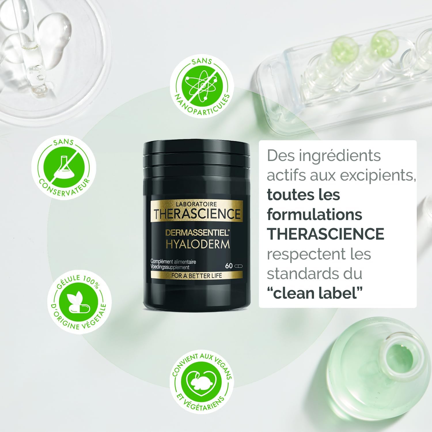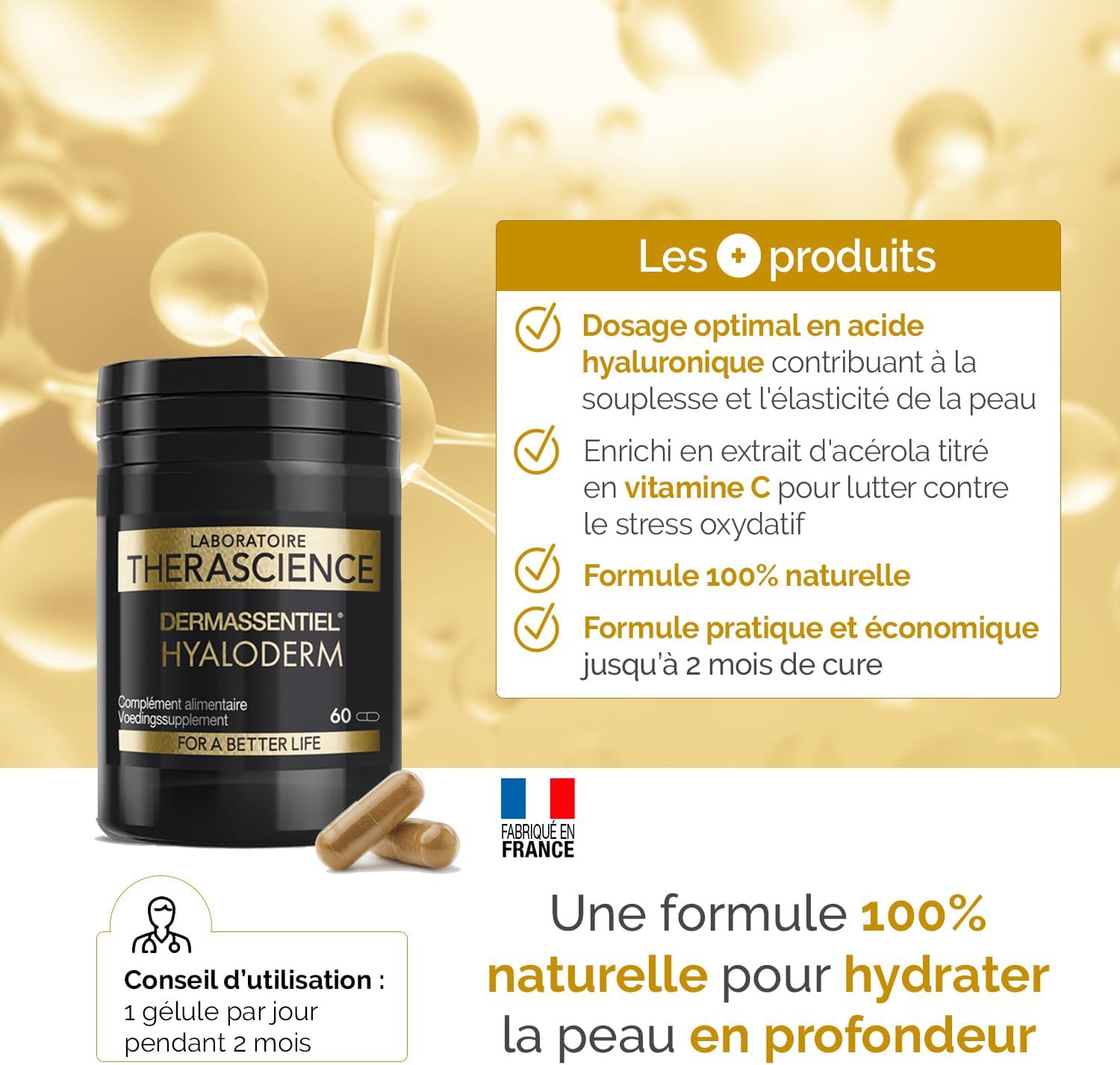 DERMASSENTIEL HYALODERM | Hydrated and plumped skin | Anti-wrinkle | 2 months cure | Natural hyaluronic acid | Acerola titrated in vitamin C anti-oxidant | 60 capsules | Laboratory THERASCIENCE