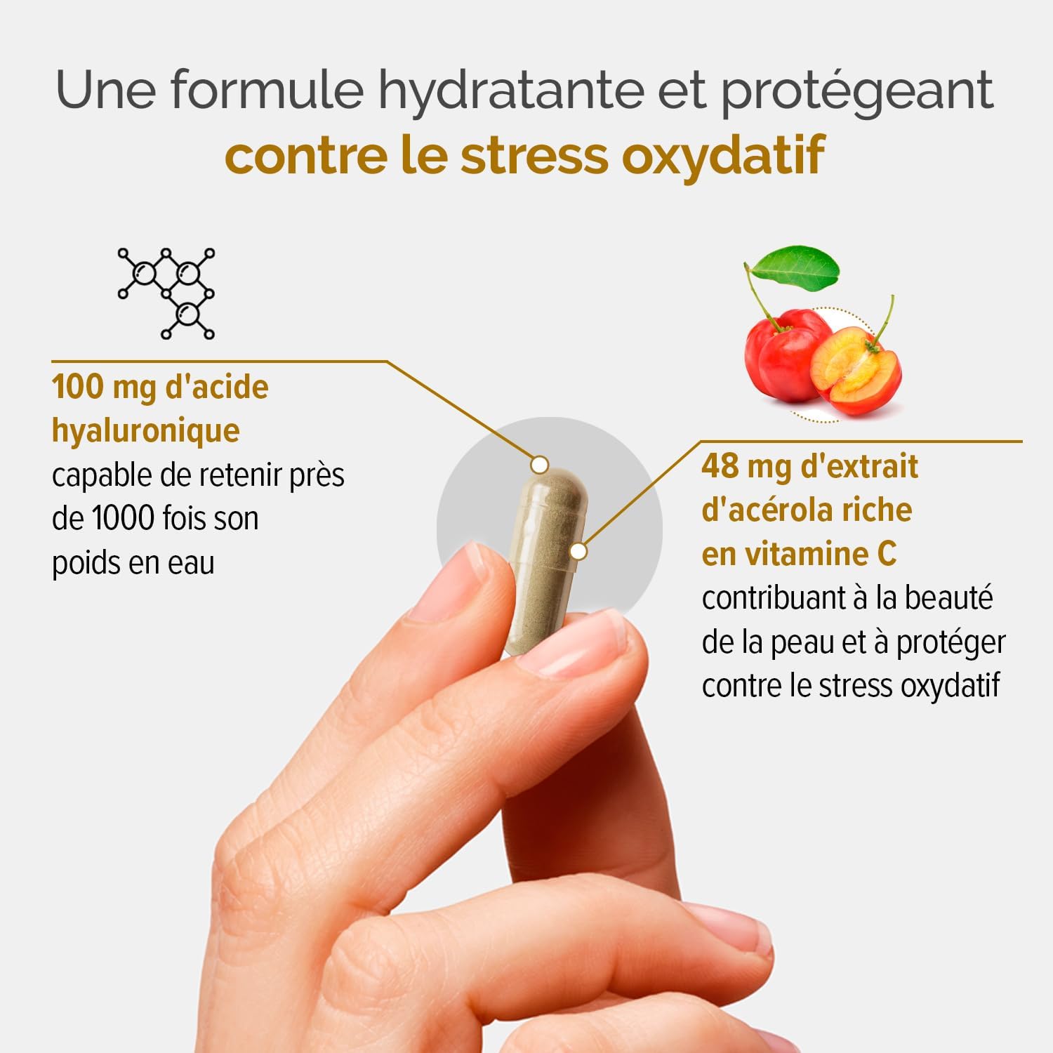 Enhanced naturality: Dermassentiel hyaloderm contains only active ingredients of natural origin: non-chemical and non-animal hyaluronic acid, natural vitamin C extracted from acerola cherry. It is also packaged in 100% vegetable capsules
