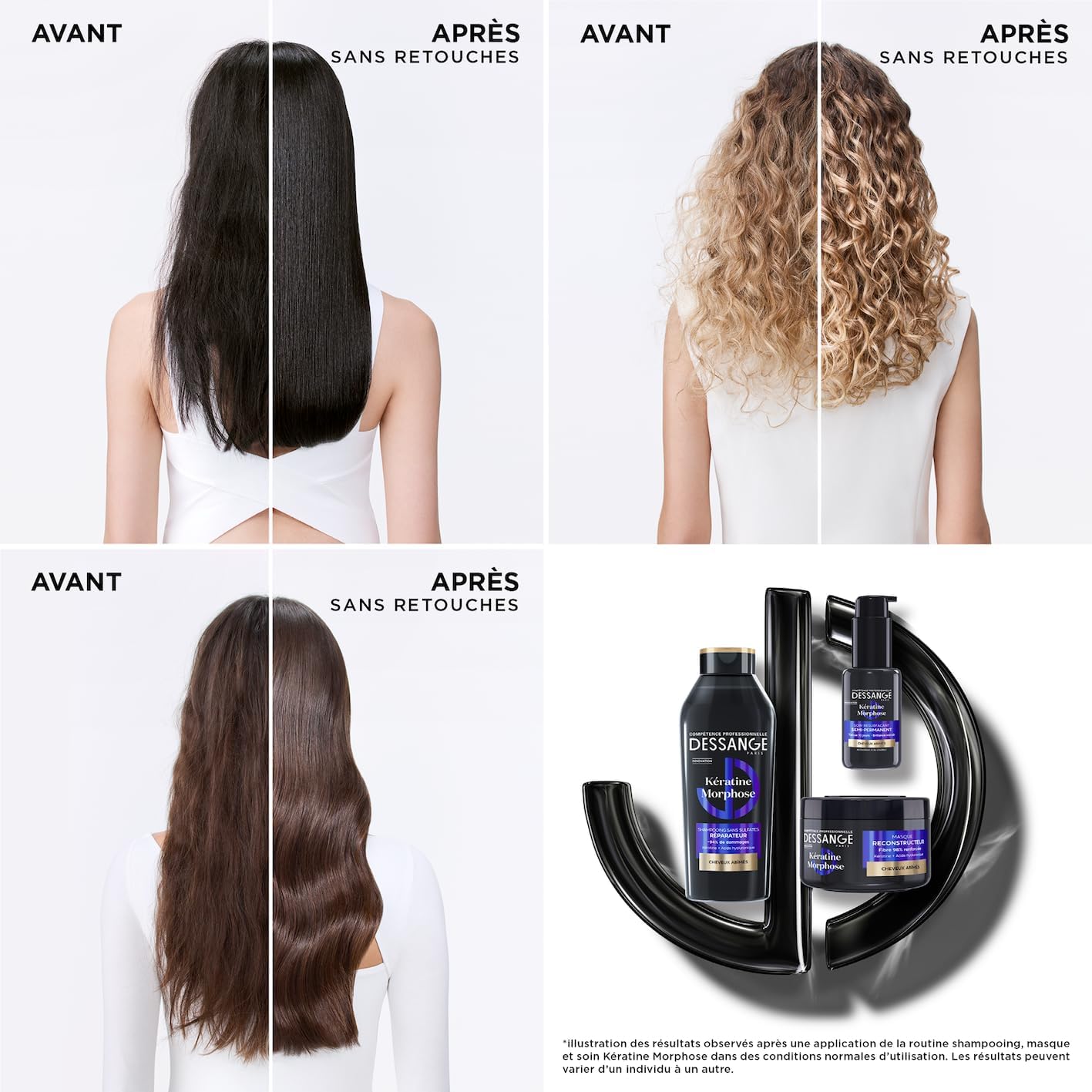Since 1992, Dessange Compétence Professionnelle, an iconic French brand, has put salon expertise at the reach of all women by offering professional hair care that sublimates the hair, without going through the hairdresser. Thanks to innovative sensory formulas adapted to each type of hair, Dessange reveals the beauty of your hair day after day. External aggressions, such as the heat of devices, chemical treatments or even pollution weaken the hair fiber, making the hair dry, dull and brittle. The Kératine Morphose women’s repair set, consisting of shampoo, mask and leave-in treatment, has been specially designed to repair, strengthen and protect weakened hair. Enriched with vegetable keratin and hyaluronic acid, these treatments deeply rebuild the fibre and provide intense hydration for soft, supple and healthy hair. *Instrumental test after application of Keratin Morphose treatment. **Instrumental test after applying the Keratin Morphose shampoo, mask and treatment. Damage related to breakage. ***Instrumental test after applying the Keratin Morphose shampoo, mask and treatment.
