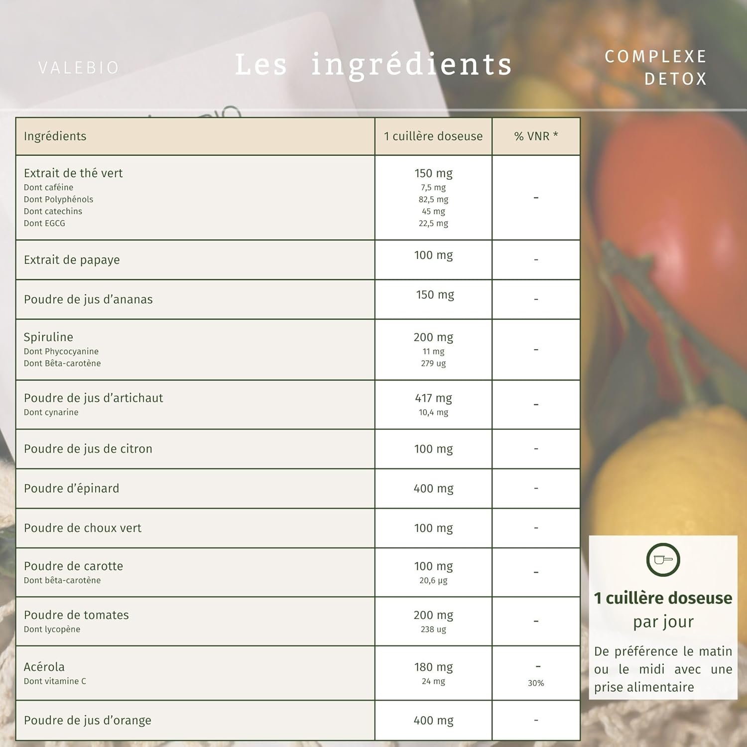 Natural supplements, environmentally friendly and made in France. The Valebio detox complex is 100% natural, made from plants, vegetables and fruits known for their detoxifying properties. It is made in France, in Marseille and is non-GMO or nano.