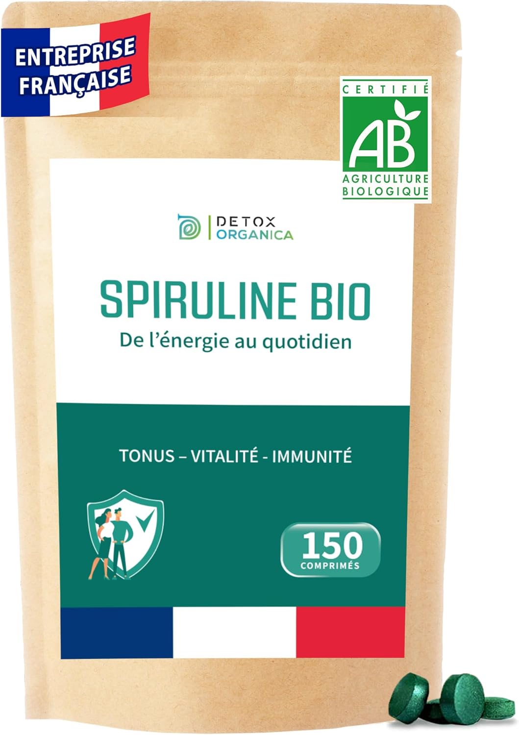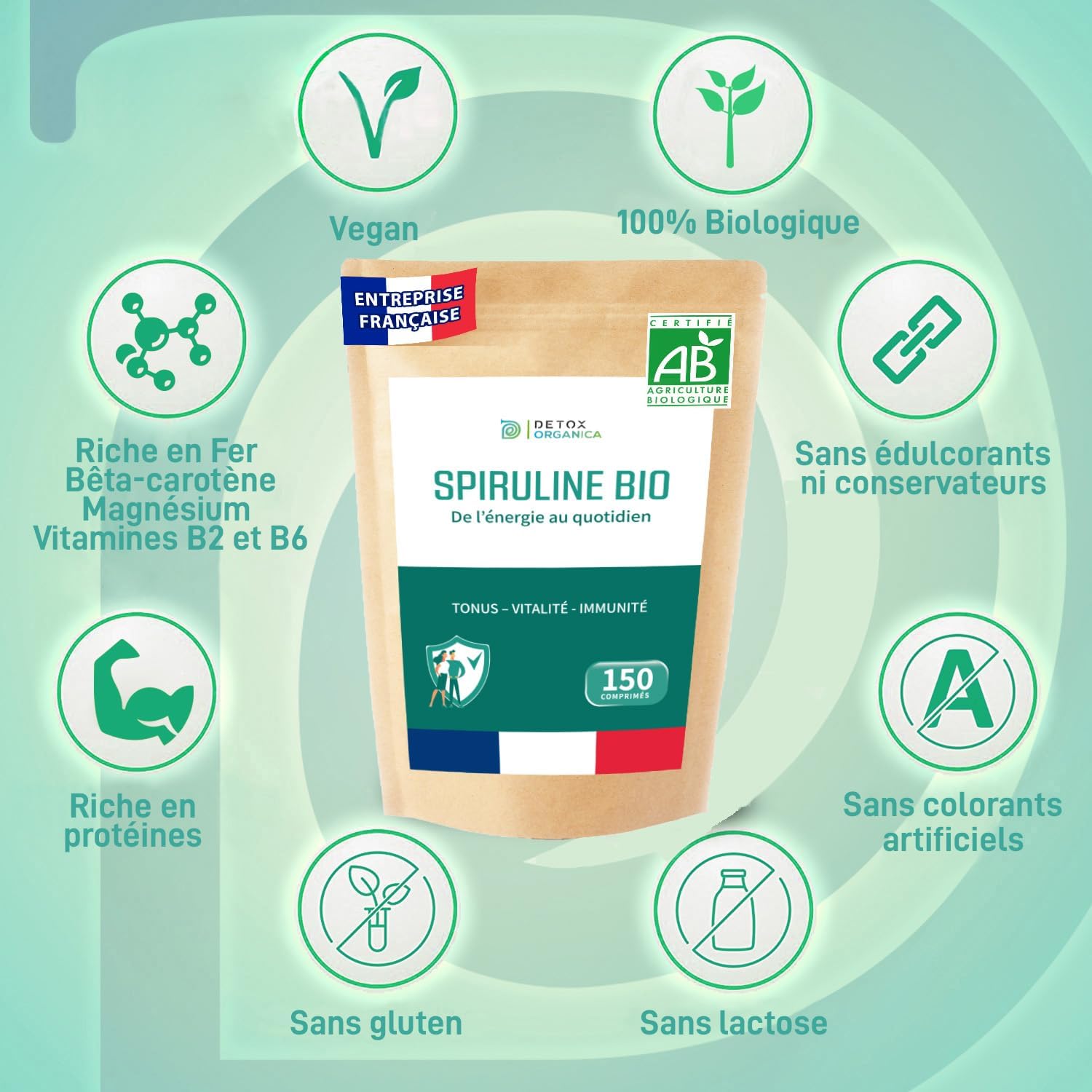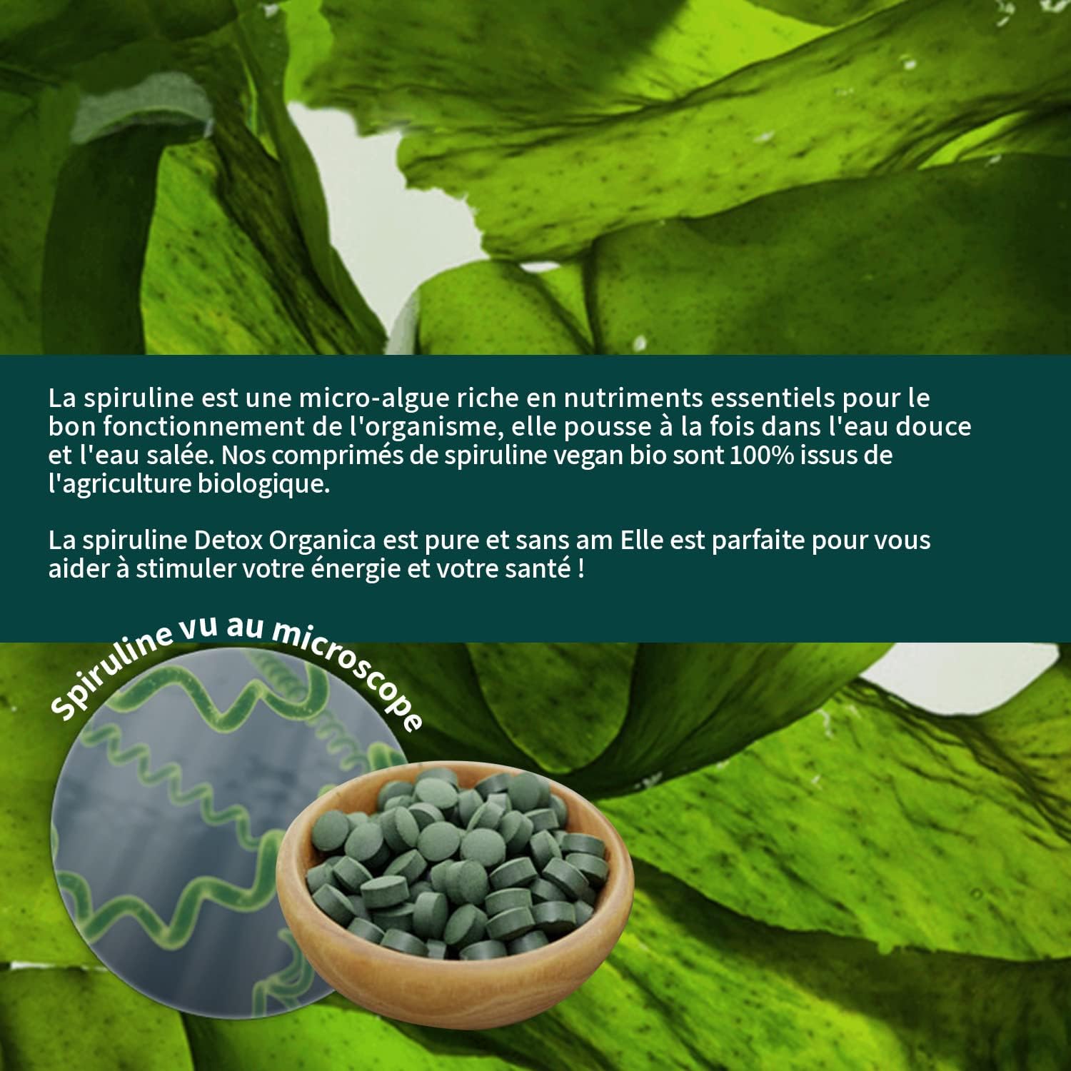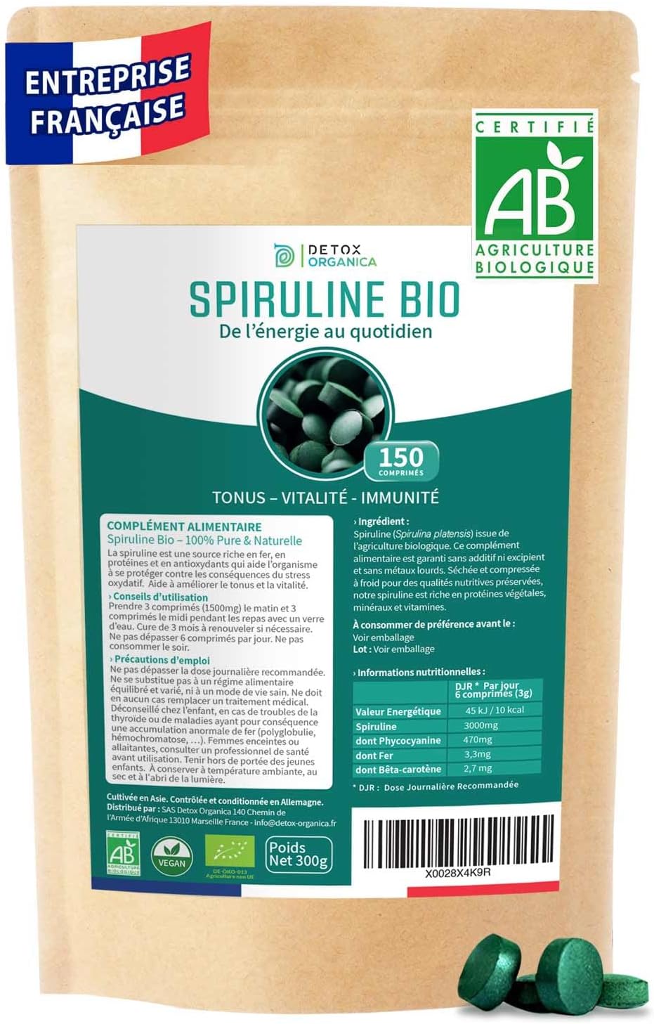 DETOX ORGANICA Organic Spirulina – 500mg per day – Sachet of 150 Organic Spirulina Tablets – Food Supplement Rich in Proteins, Antioxidants, Iron and Phycocyanin – Controlled Organic Agriculture