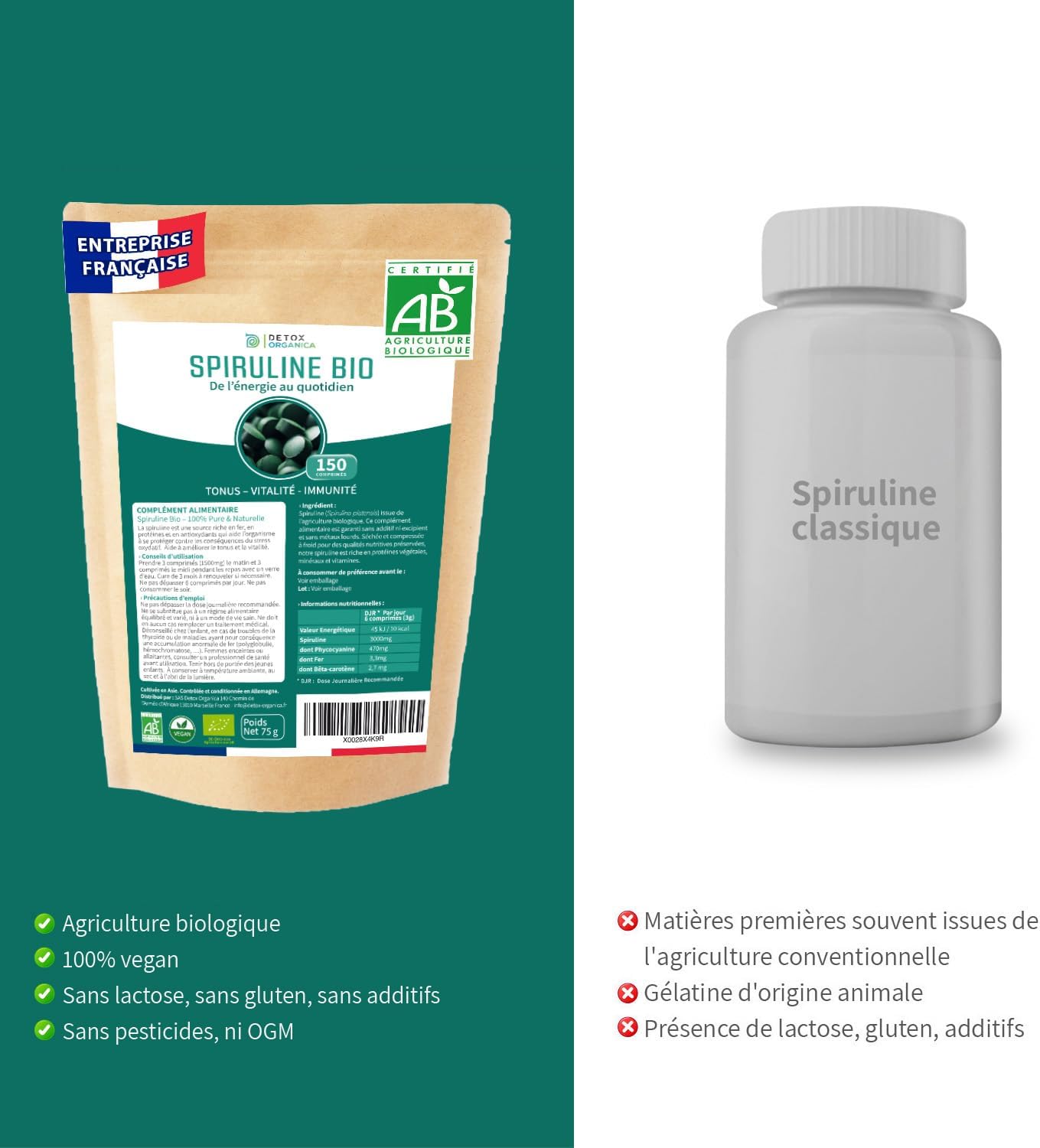 Quality product certified organic: Spirulina (Arthrospiral) platensis Detox Organica from organic farming has a unique nutritional composition and meets the highest standards for consumption with confidence. Grown in Asia and controlled in Europe, it is guaranteed free of pesticides, GMOs, heavy metals and excipients.