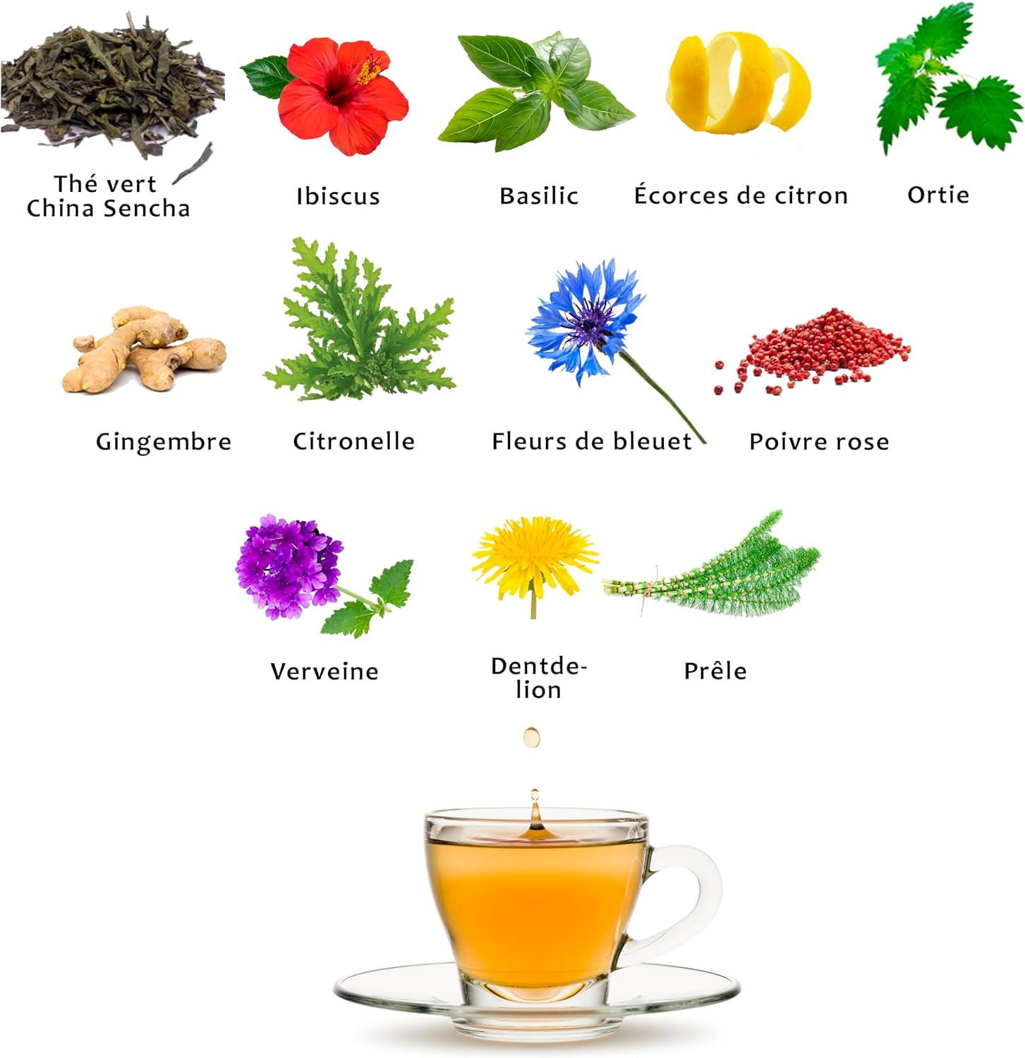 Baies de Goji, Curcuma Pissenlit, Racine de Bardane Menthe verte, Framboises Thé noir, Noix de coco, Bergamote Réglisse, Cannelle Citron, Gingembre