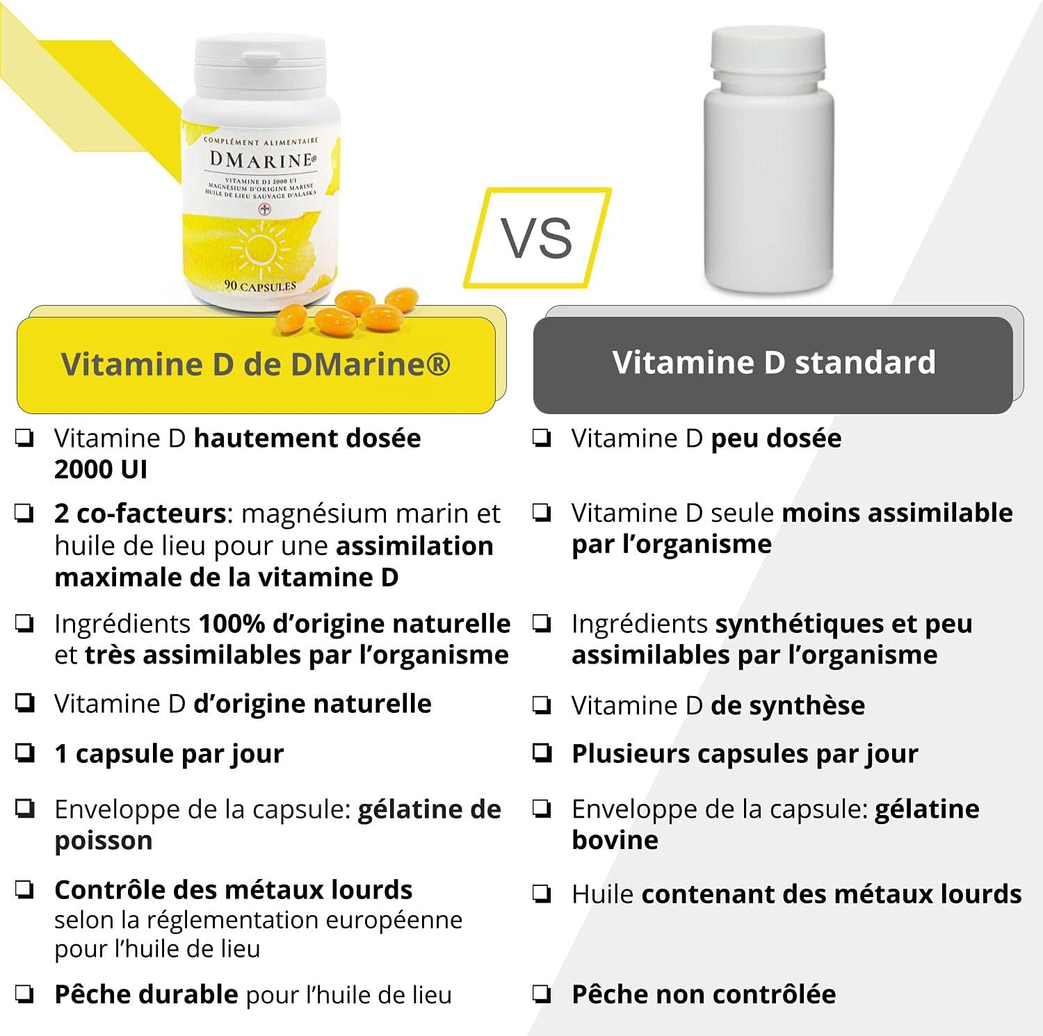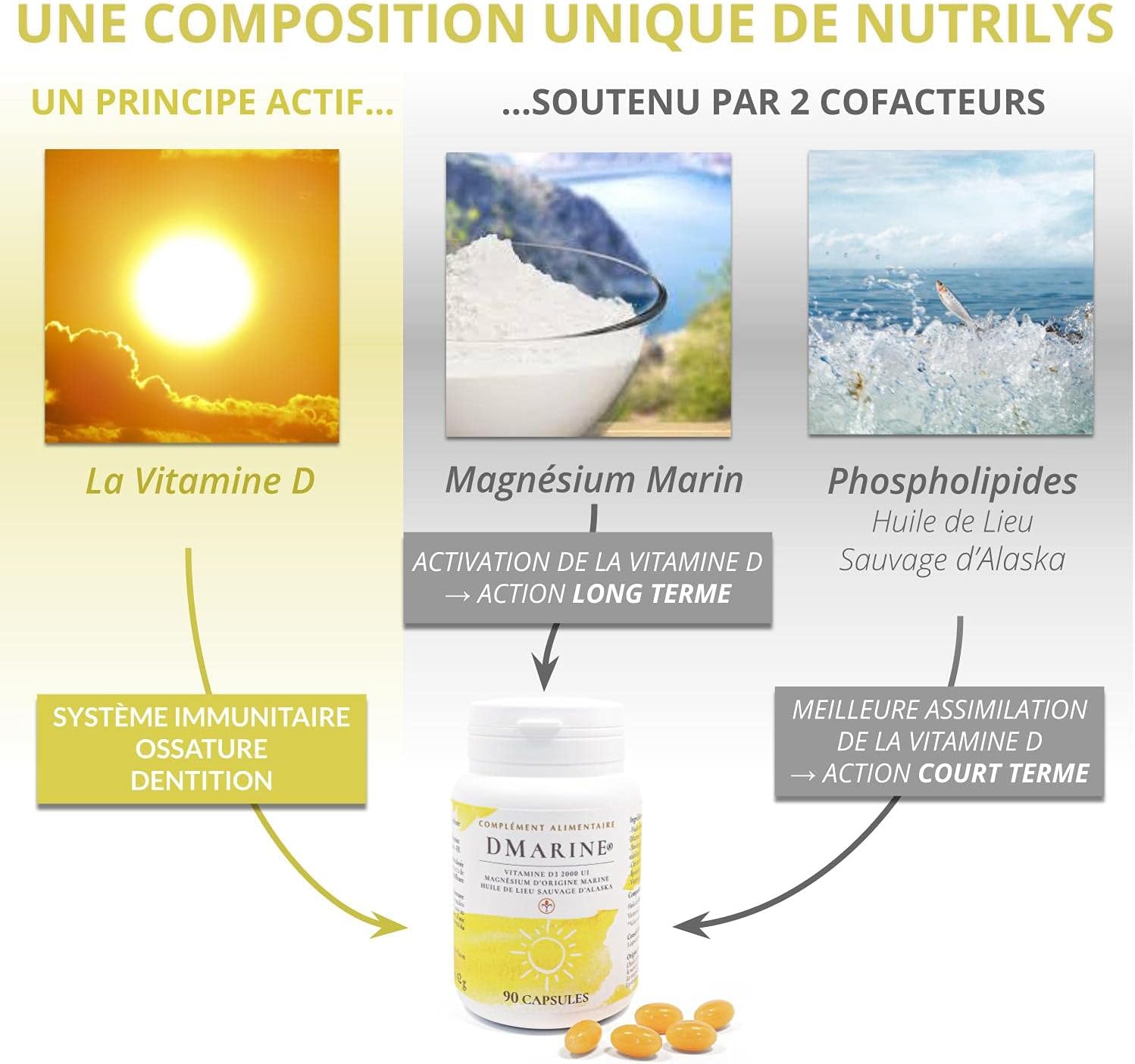 A HIGHLY ASSIMILABLE FOOD SUPPLEMENT: Thanks to magnesium of marine origin as well as phospholipids, vitamin D3 highly dosed at 2000 IU is absorbed more effectively by the body.