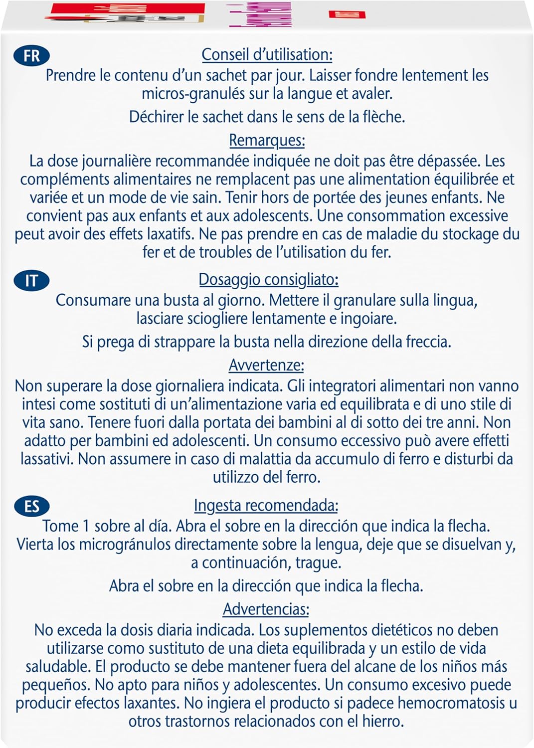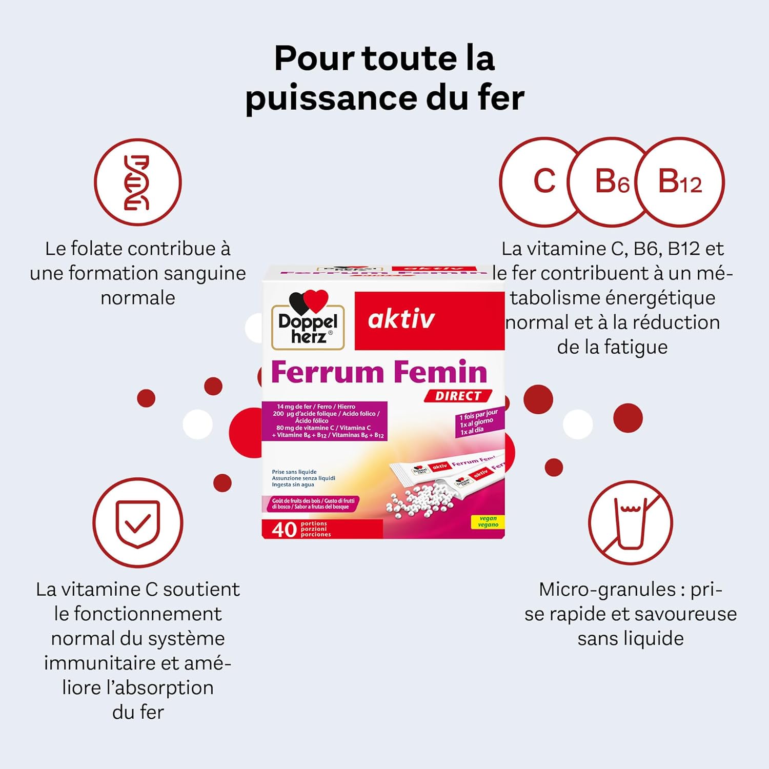 Box contents: 40 microgranules – Food supplement with sweeteners – granules containing iron, folic acid, vitamin C, vitamins B6 and B 12, wild fruit taste