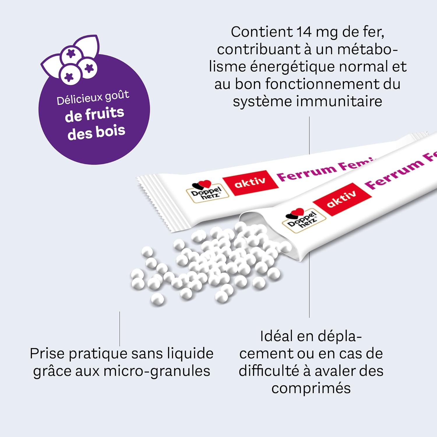 Microgranules: The modern dosage shape for quick and direct setting – the fine granulate beads with a wild fruit taste can be taken anytime and anywhere without any liquid – Ideal on the go or in case of difficulties taking tablets. Microgranules: The modern dosage form for quick and direct setting – The fine granulate beads with a taste of wild fruit can be taken at any time. moment and everywhere, without NO LIQUID – Ideal on the go or for difficulties taking pills