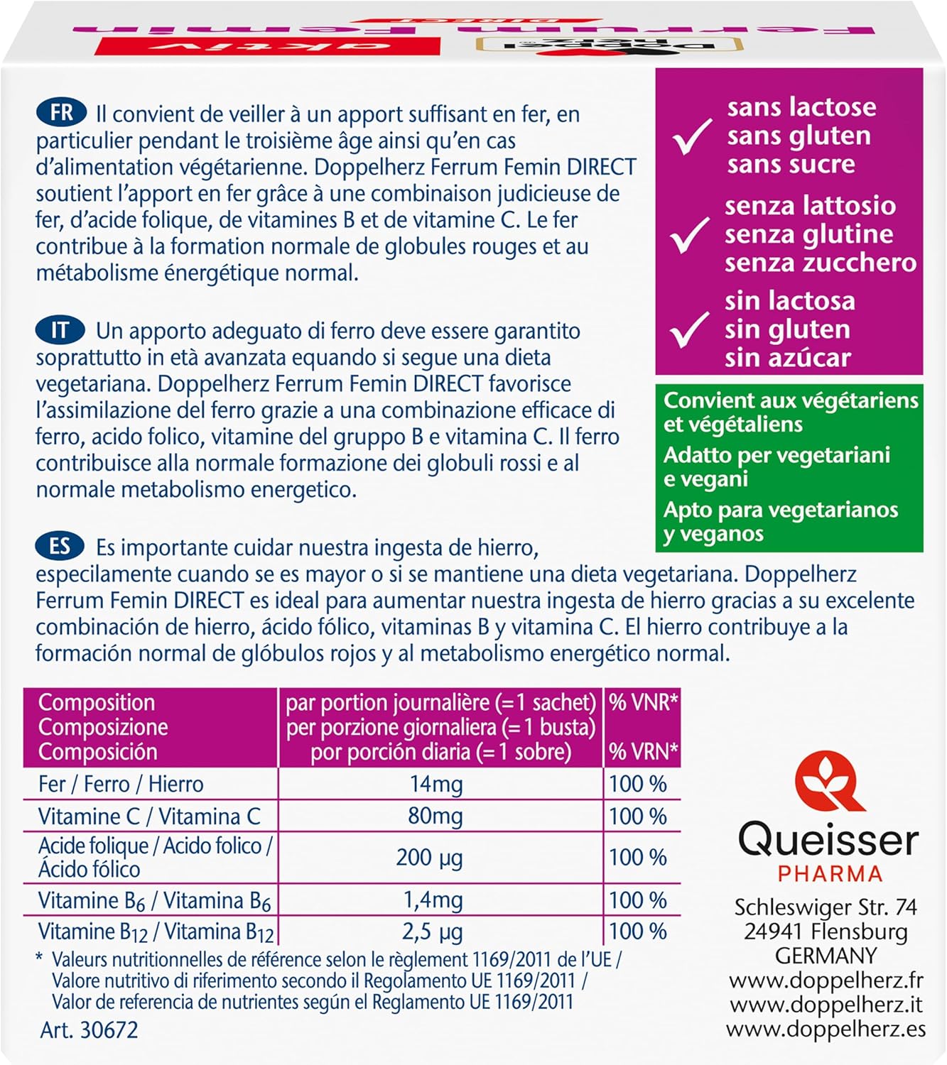 Doppelherz Ferrum Femin with Vitamin C + B6 + B12 + Folic Acid – 14 mg Iron for Normal Red Blood Cell Formation – 40 Sachets