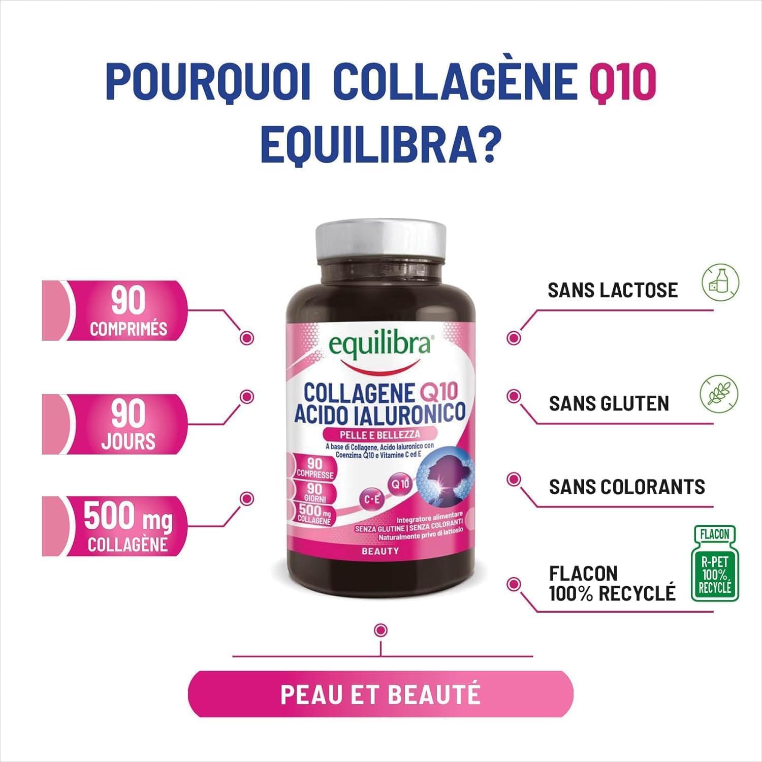 Collagen Q10 Hyaluronic Acid is a food supplement containing collagen, hyaluronic acid and coenzyme Q10 to maintain the well-being of the skin from the inside. It also contains Vitamin C, which contributes to the normal formation of collagen, and Vitamin E, which helps protect cells from oxidative stress. Directions for use: Take 1 tablet daily, with a glass of water, preferably in the morning. It is recommended to take the product for at least 8-12 weeks. It is possible to divide the tablet into 2 parts thanks to the pre-cut. To promote the well-being and beauty of the skin from the inside, we recommend using Equilibra Collagen Q10 Hyaluronic Acid as a complement to your daily beauty routine