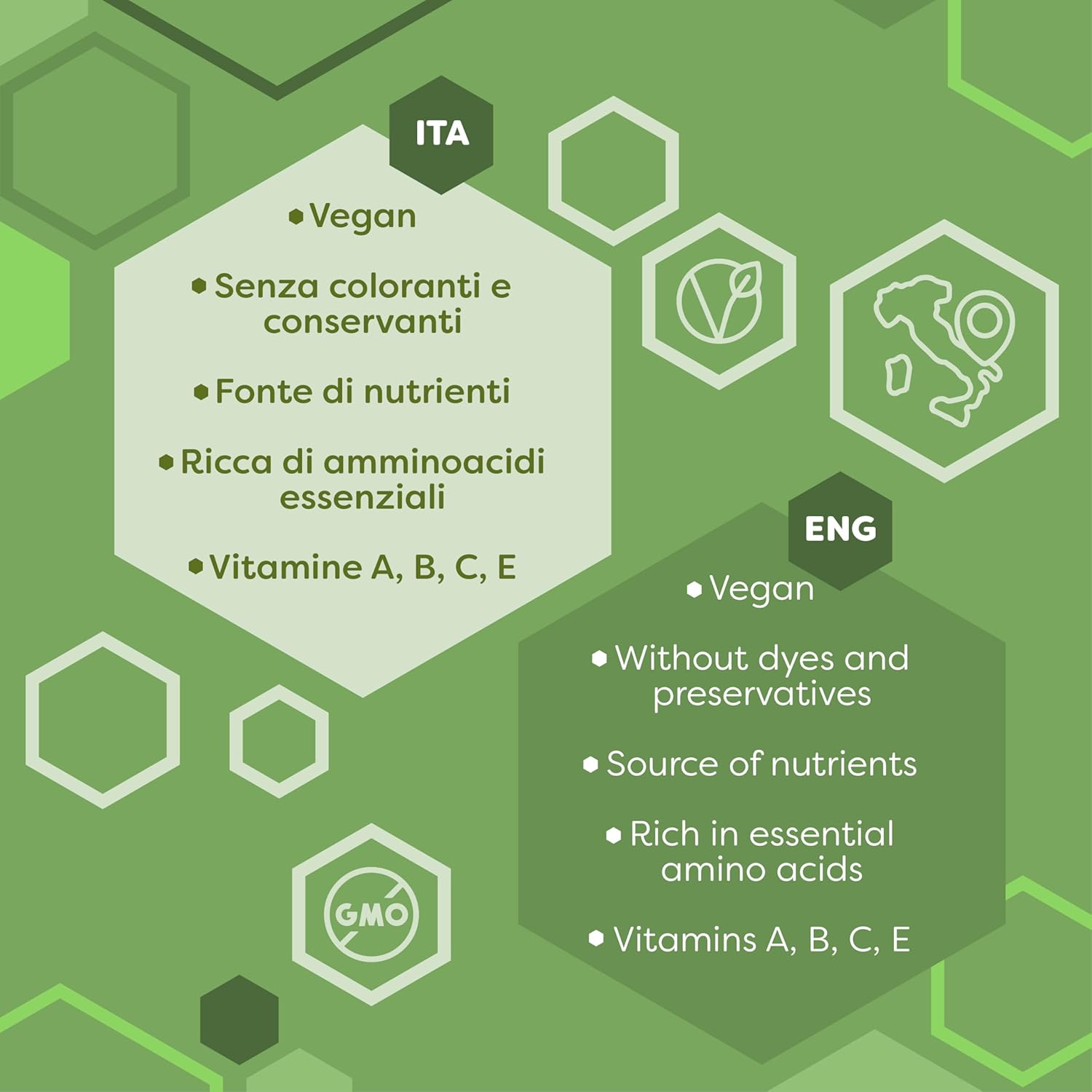 CHLORELLA PROPERTIES – Chlorella seaweed is an important source of essential nutrients: it contains approximately 45% protein, 20% fat, 20% carbohydrates, 5% fiber and 10% vitamins (A, B, C, E) and minerals (iron, zinc, sulfur, phosphorus, potassium). It is also rich in essential amino acids such as phenylalanine, isoleucine, leucine, lysine and others.