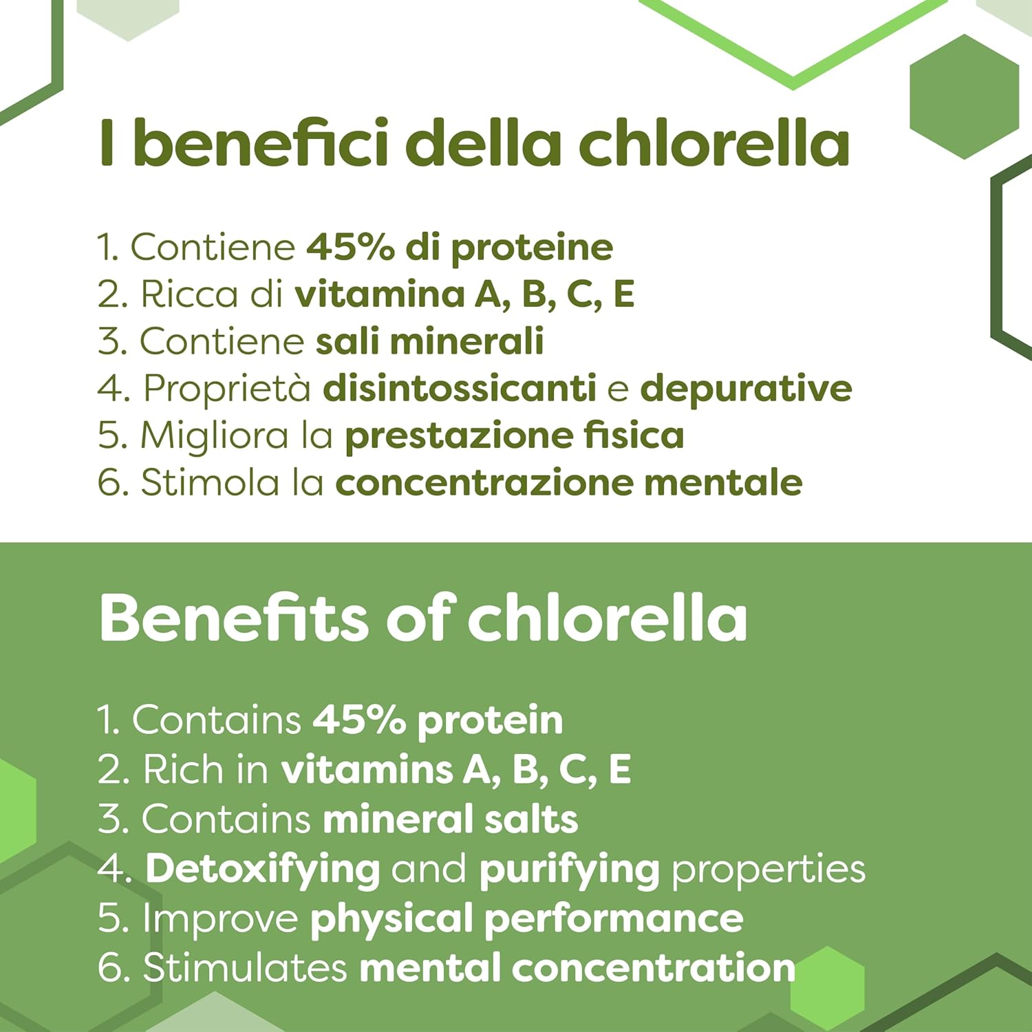 NATURAL PRODUCT – Chlorella has important detoxifying and purifying properties that promote intestinal activity and the elimination of toxins. Chlorella seaweed is especially indicated for people who engage in intense sports activity as it improves physical performance, for students and people who need special mental concentration and for people who follow special diets