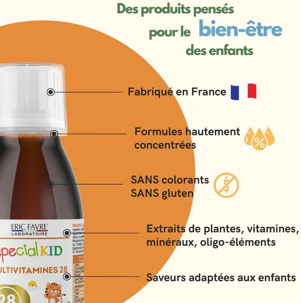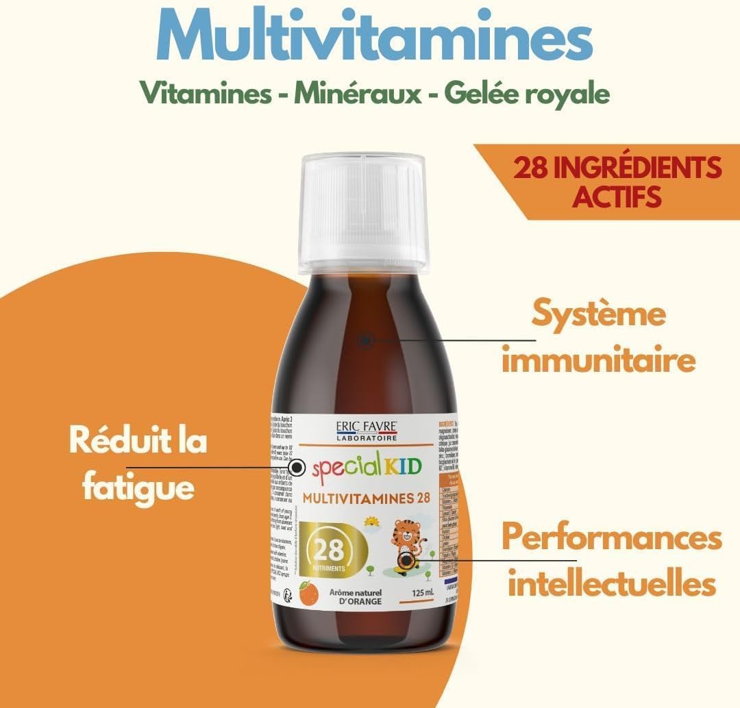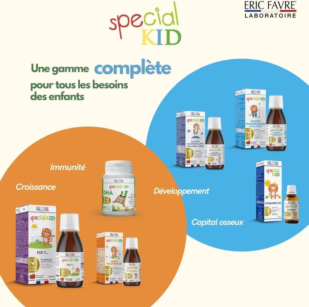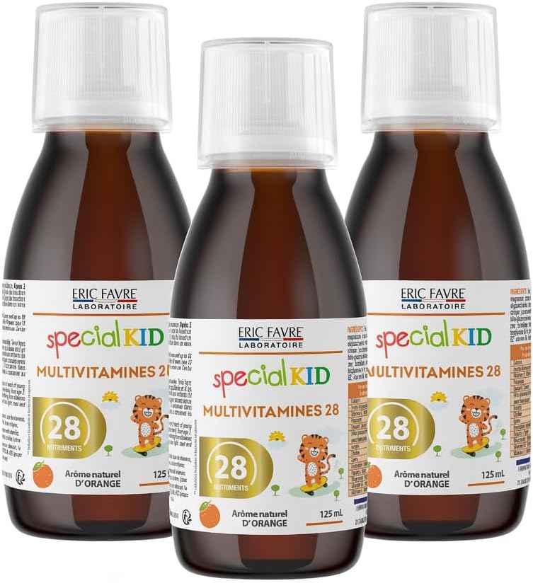 Eric Favre Laboratoire SPECIAL MULTIVITAMINS 28 – Bone Growth & Development – 125 ml – Vitamins A, B, C, D3, E, Calcium, Magnesium, Zinc, Iron – Orange Flavour – Measuring Cap – Set of 3