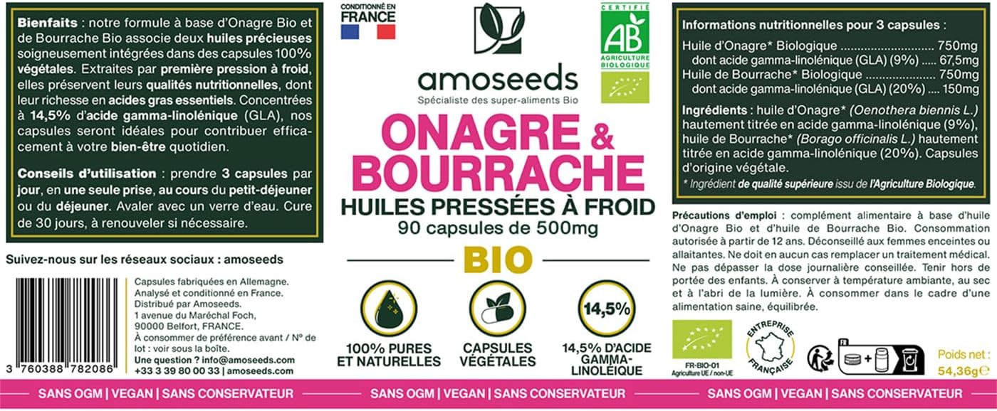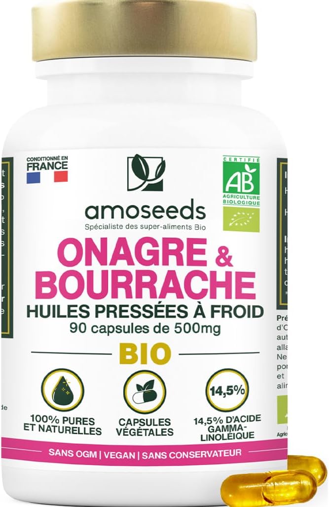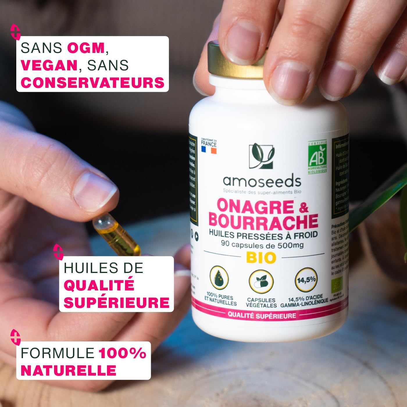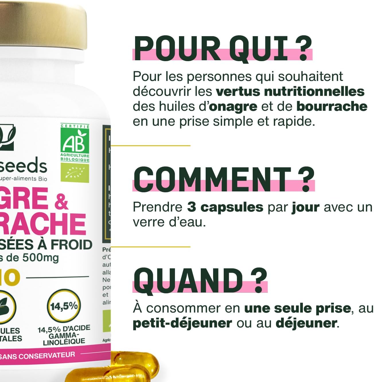 UTILISATION ET QUALITÉ : Huile d'Onagre et Bourrache Bio Capsules végétales Riche en Acides Gras Amoseeds Super-Aliments BioHuile d'Onagre et Bourrache Bio Capsules végétales Riche en Acides Gras Amoseeds Super-Aliments Bio CONSEILS D’UTILISATION