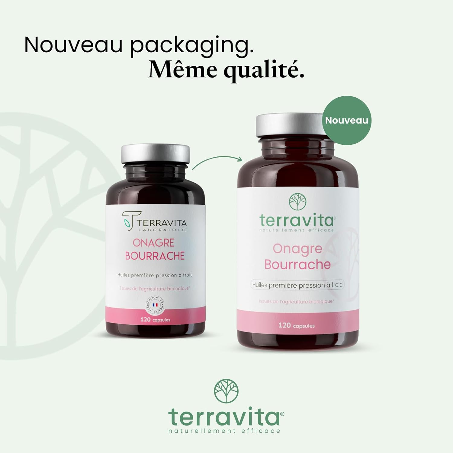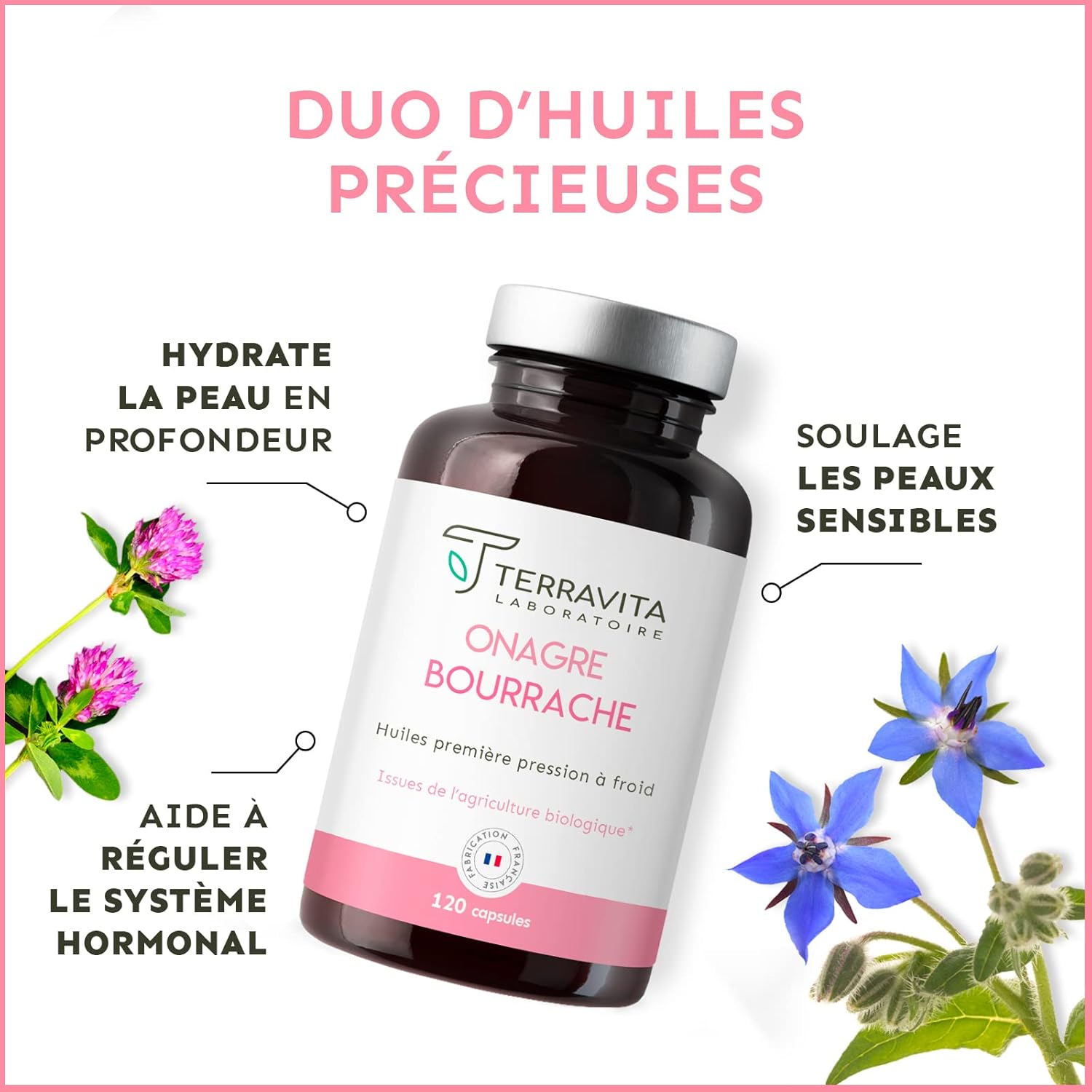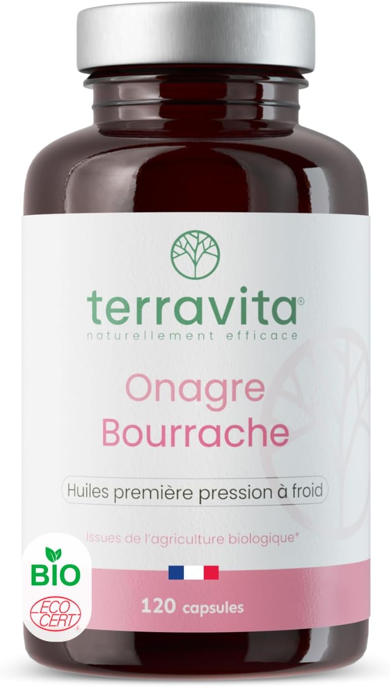 Evening Primrose and Borage | Organic First Cold Press Oils | 120 Capsules of 500 mg | Deep Skin Hydration | Hormone System Regulation | Ecocert Label | Made in France | Terravita
