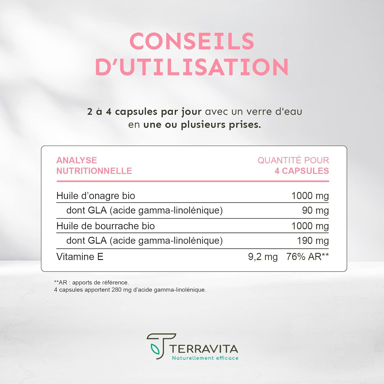 Organic evening primrose seed oil* (œnothera biennis L. ), organic borage seed oil* (Borago officinalis L. ), tunic: fish gelatin and humectant (glycerin), vitamin E (d-alpha-tocopherol).