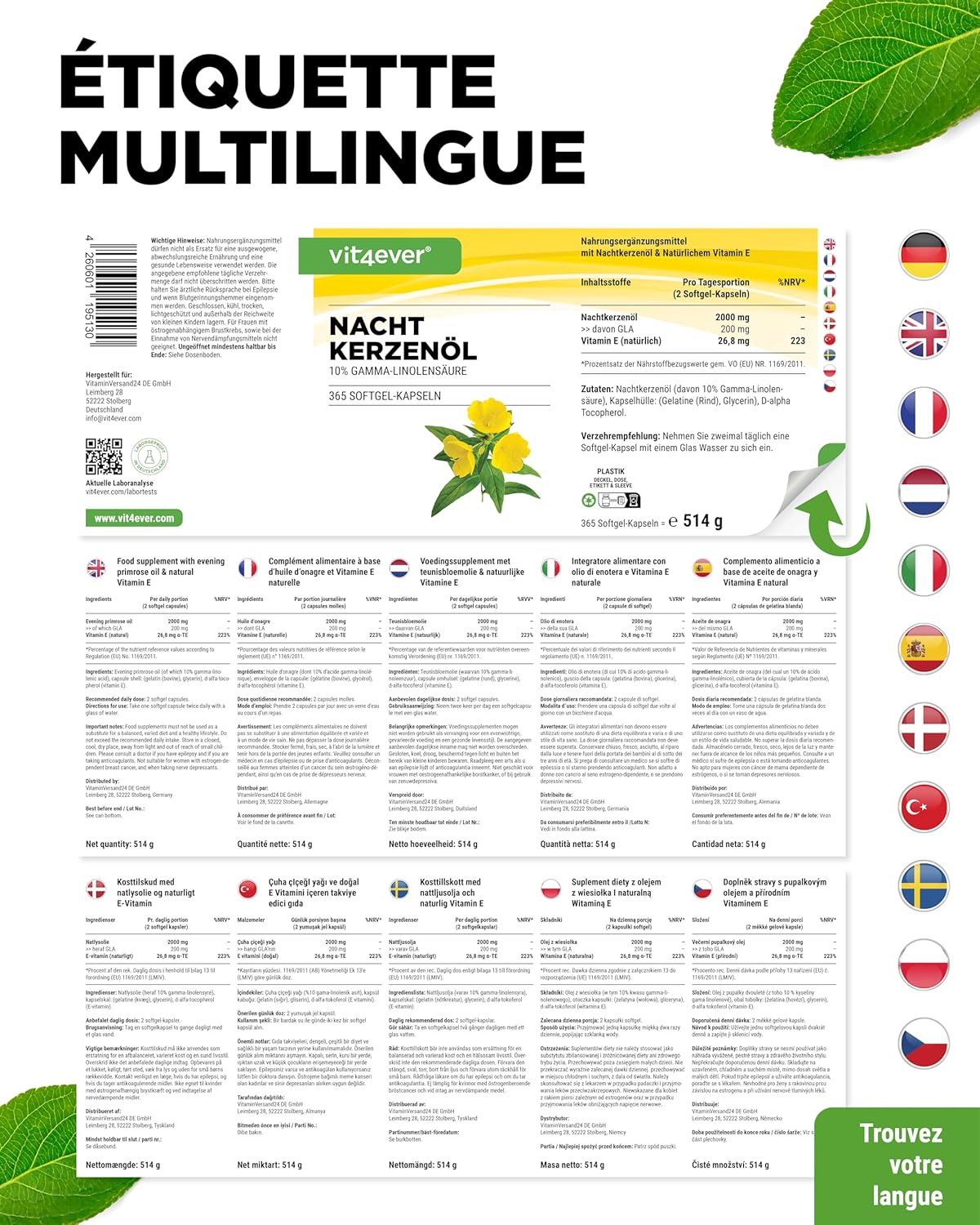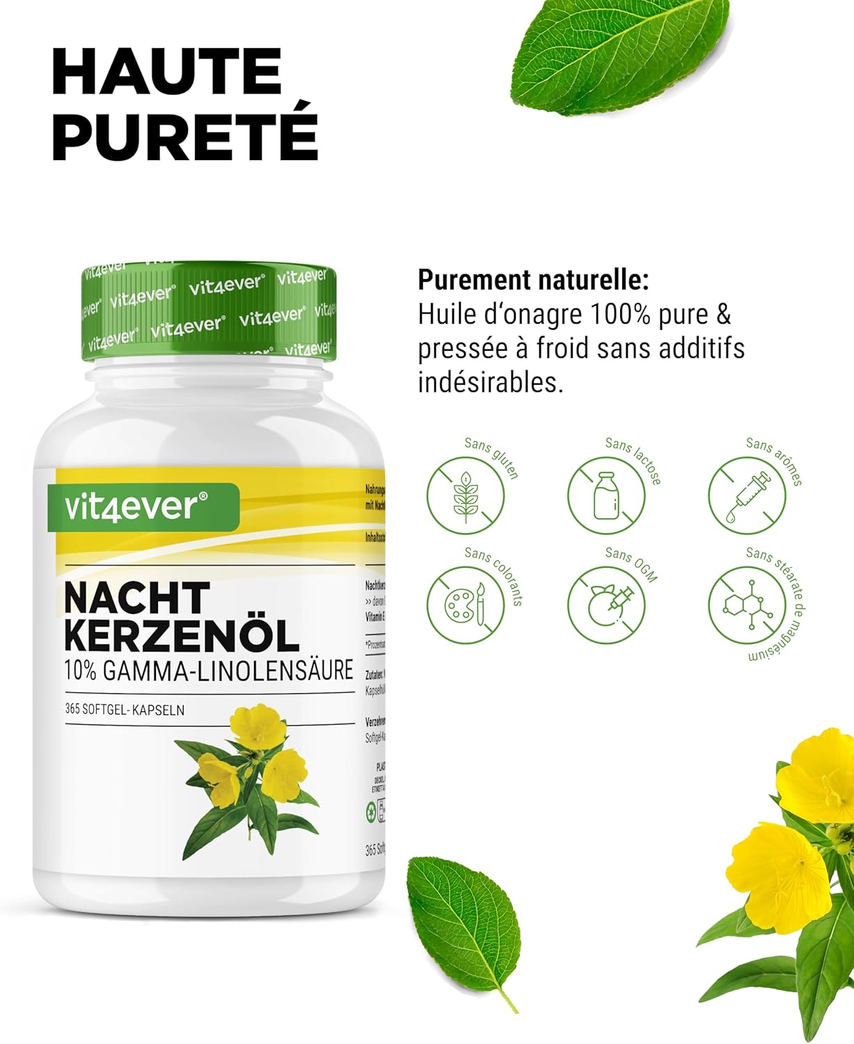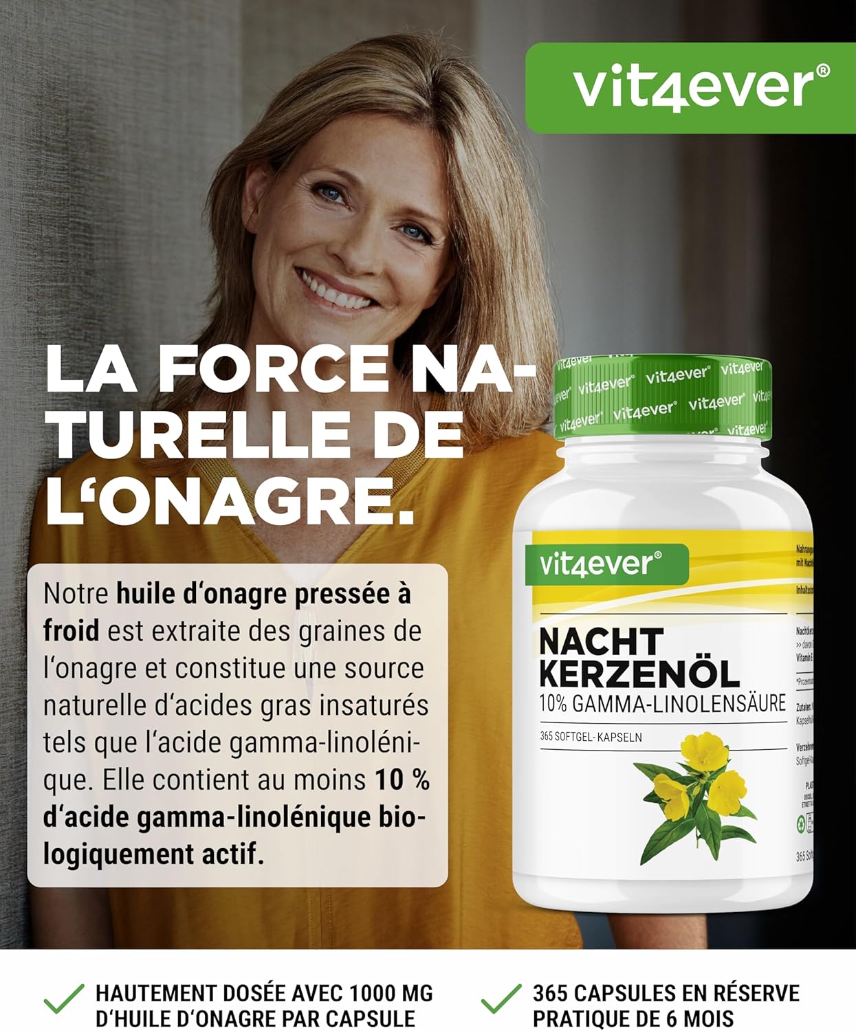 Evening Primrose Oil – 365 Capsules – Highly Dosed with 2000 mg per Daily Dose – Premium: 10% Gamma Linolenic Acid GLA, with Natural Vitamin E & Cold Pressed