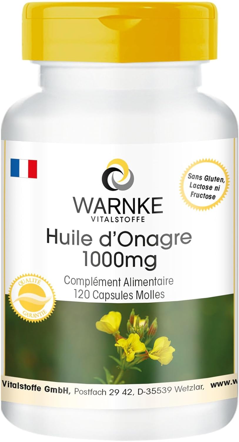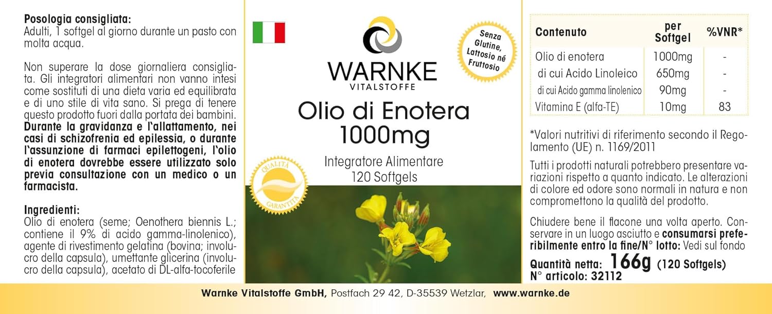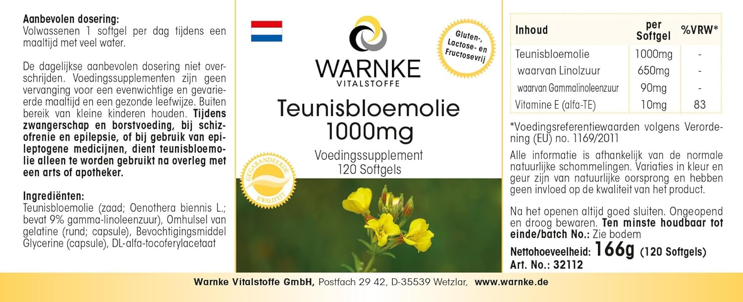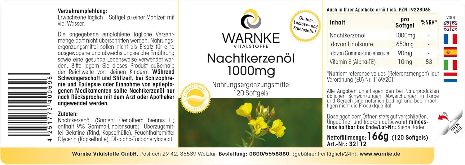 Evening primrose oil – with 1000mg of evening primrose oil including 650mg of linoleic acid and 10mg of vitamin E – 120 softgels – German pharmacy quality – highly dosed -| Warnke Vitalstoffe