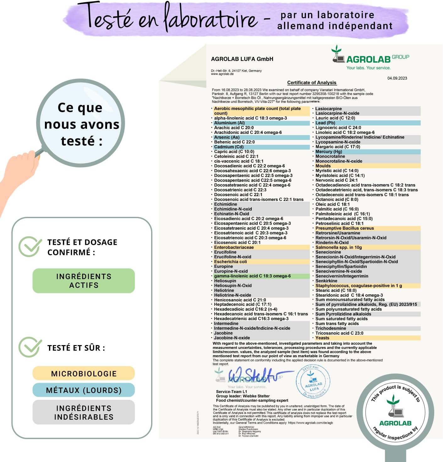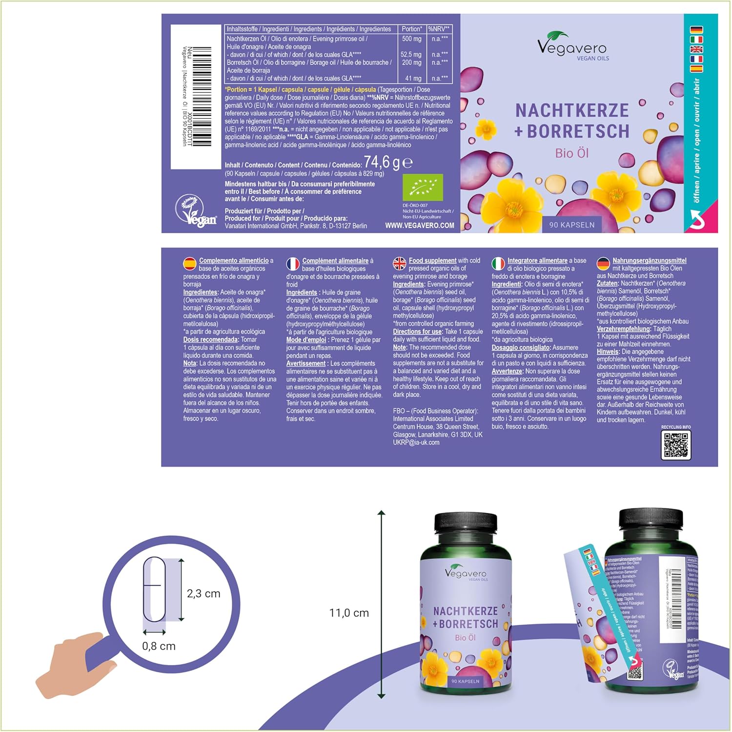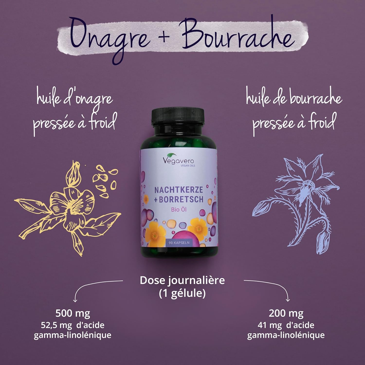 ⭐ NATURAL SOURCE OF OMEGA 6: The combination of organic evening primrose oil and borage oil offers a synergistic of valuable phytonutrients, including AGL (gamma-linoleic acid) which is an omega 6 essential fatty acid that the body cannot produce. It plays a fundamental role in several vital functions such as the structure of cell membranes. Our organic evening primrose oil contains 10.5% GLA and our borage oil contains 20.5%.