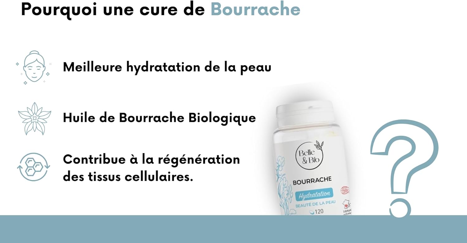 FACE HYDRATION & SKIN BEAUTY – Organic Borage Oil – 120 capsules – Belle & Organic Food Supplement – Made in France