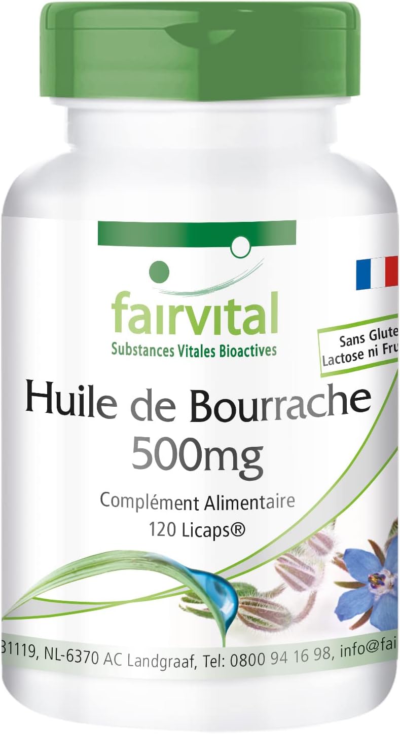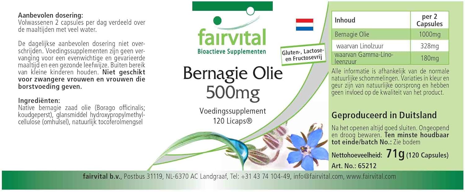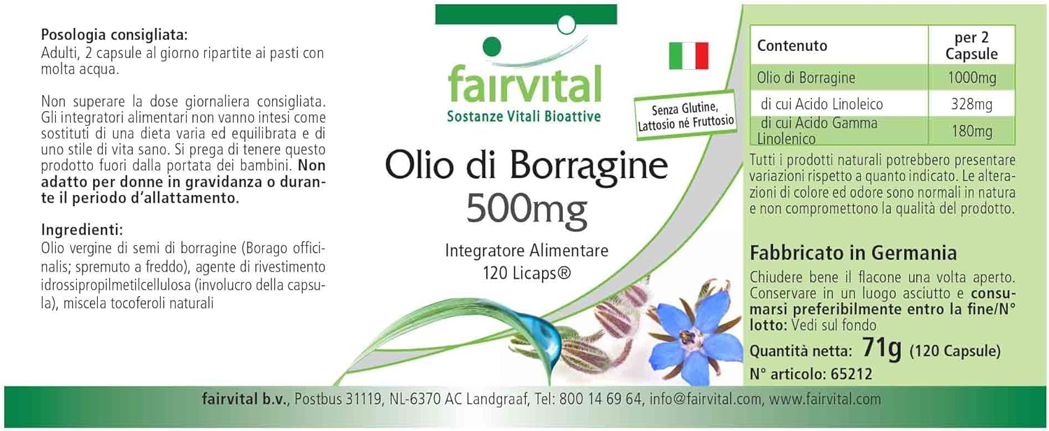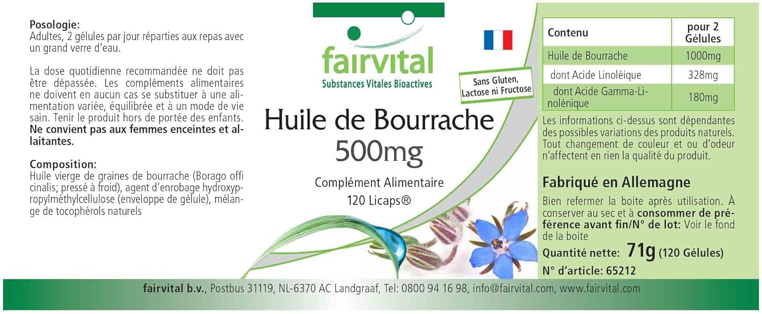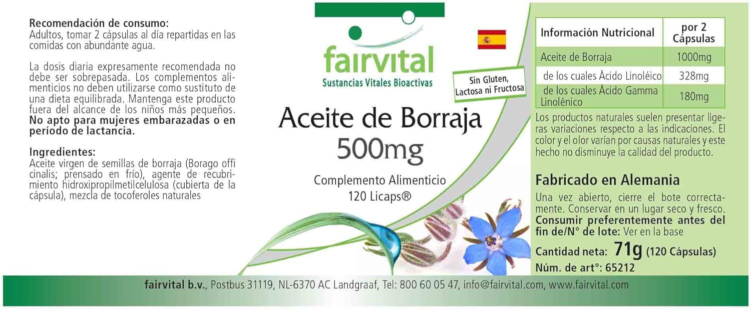 ✔ fairvital GERMAN QUALITY: Daily dose: 2 capsules per day containing borage oil 1000 mg is linoleic acid and 328mg gamma-linolenic 180. High dosages! Great value for money! Cold pressed from Borago officinalis seeds.