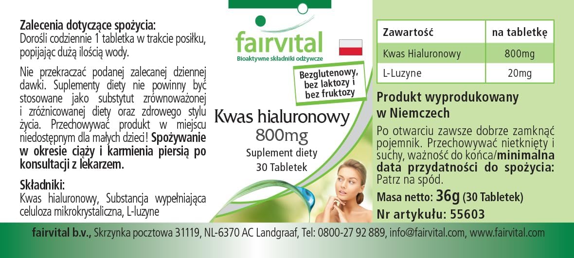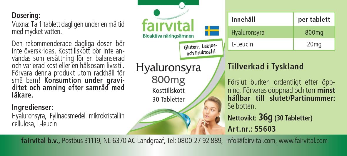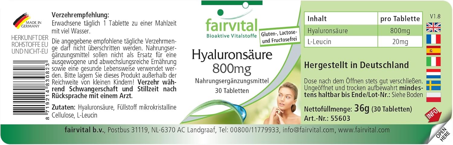 ✔ fairvital GERMAN QUALITY: Daily dose: one tablet contains 800 mg of hyaluronic acid. Extra high dosage! Great value for money! fairvital Vegan Hyaluronic Acid comes from natural fermentation.