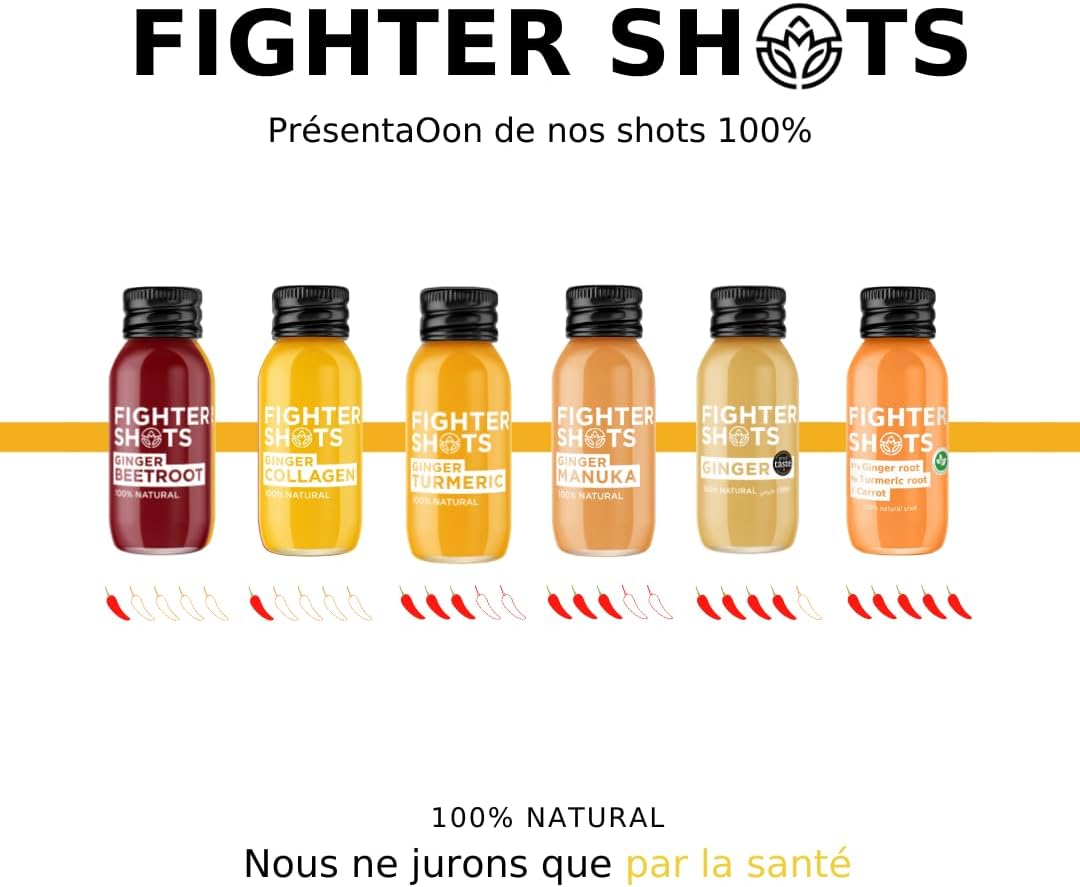 Email It? Our Fighter Shots contains organic cold pressed ginger as well as honey and lemon, which are known for their antiseptic properties and vitamin C content. We possess a range of five shots with powerful properties to enhance your daily well-being. Find the shot that’s right for you, Fighter Shots has a shot for everyone, so don’t miss yours.