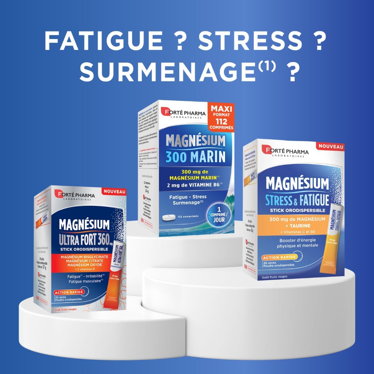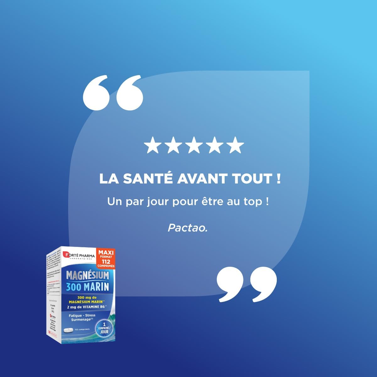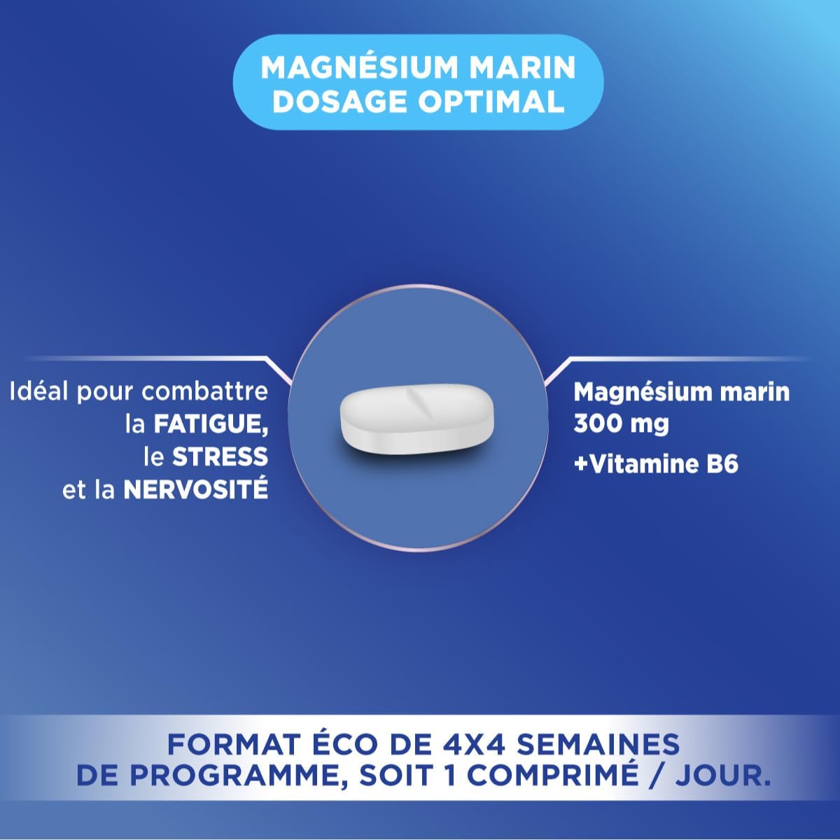 A lack of magnesium can translate in different ways. Fatigue, stress, nervousness are very often the first manifestations. To react at the first signs of a magnesium intake deficiency, Forté Pharma Laboratories have developed Magnesium 300 Marin. Its formula combines magnesium naturally present in seawater and vitamin B6 to help reduce fatigue and the normal functioning of the nervous system. Vitamin and mineral content 1 tablet: DJM* / NRV**: Magnesium: 300 mg – 100% *DJM/ 80% **VNR; Vitamin B6: 2 mg – 100%*DJM/ 142%**NR. *DJM: Maximum Daily Dose **NRV: Nutritional Reference Value