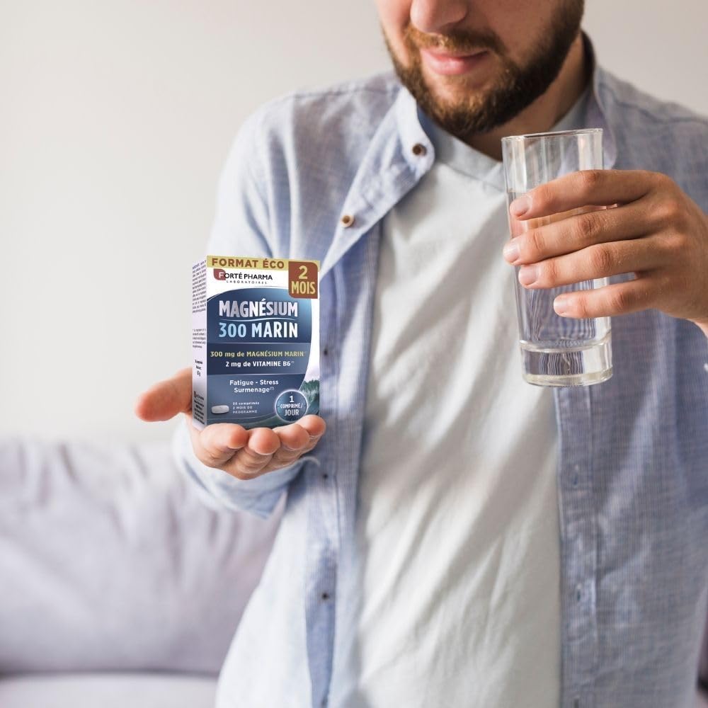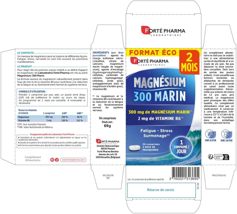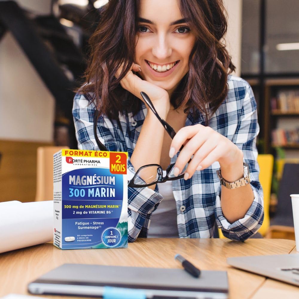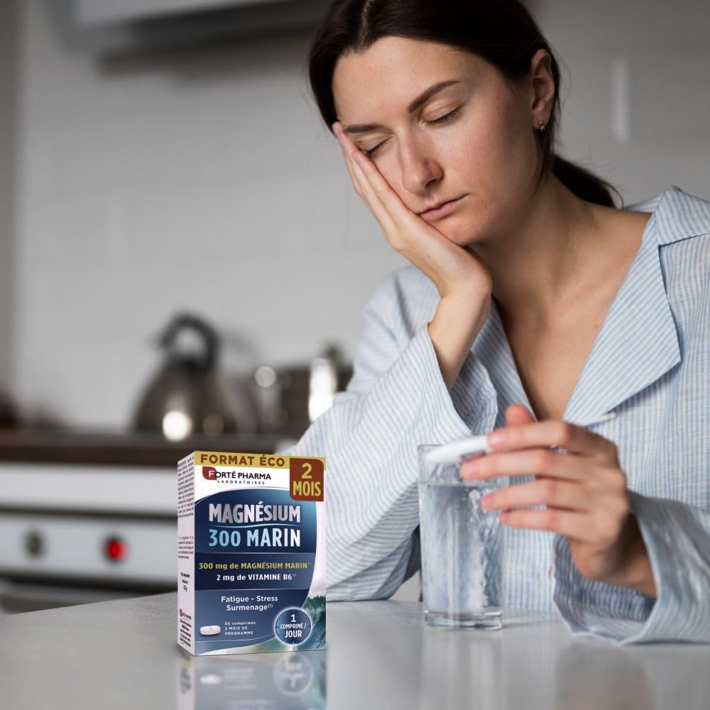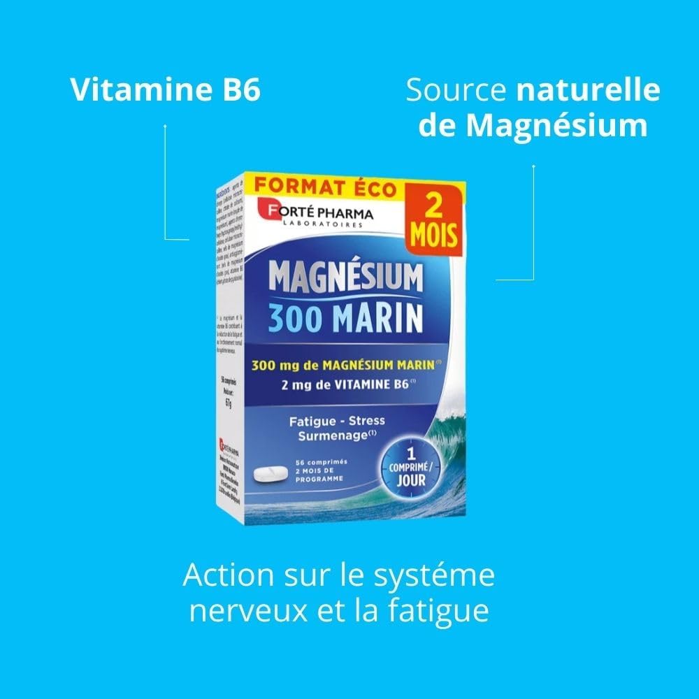 Forté Mag 300 Marine from Forté Pharma is a dietary supplement based on marine origin magnesium and vitamin B6 that help reduce fatigue and normal functioning of the nervous system. The lack of magnesium in the body can manifest itself in nervousness and stress. Use: 1 tablet per day with a large glass of water (200 ml) preferably in the morning during the meal. Renewable 8-week program.