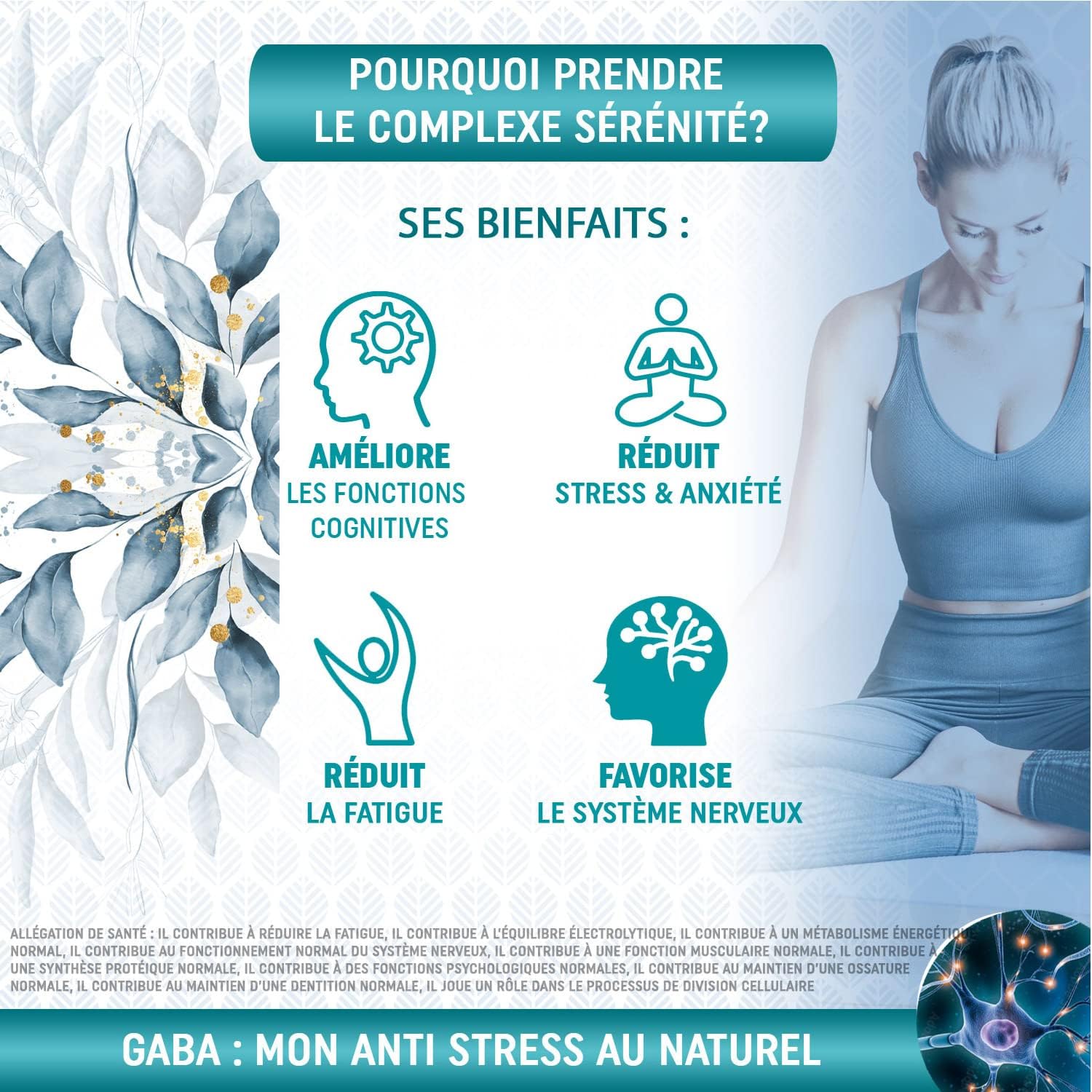 GABA: ALLIÉ ANTI STRESS ANXIETY N°1 ●● Gaba is a neurotransmitter that acts as a natural relaxant. Combined with magnesium and vitamin B6, it becomes a perfect mix to reduce stress, anxiety and improve your quality of life. Thanks to its relaxing action, it will help you achieve better mental clarity and sleep better, allowing you to face everyday challenges with serenity and concentration.