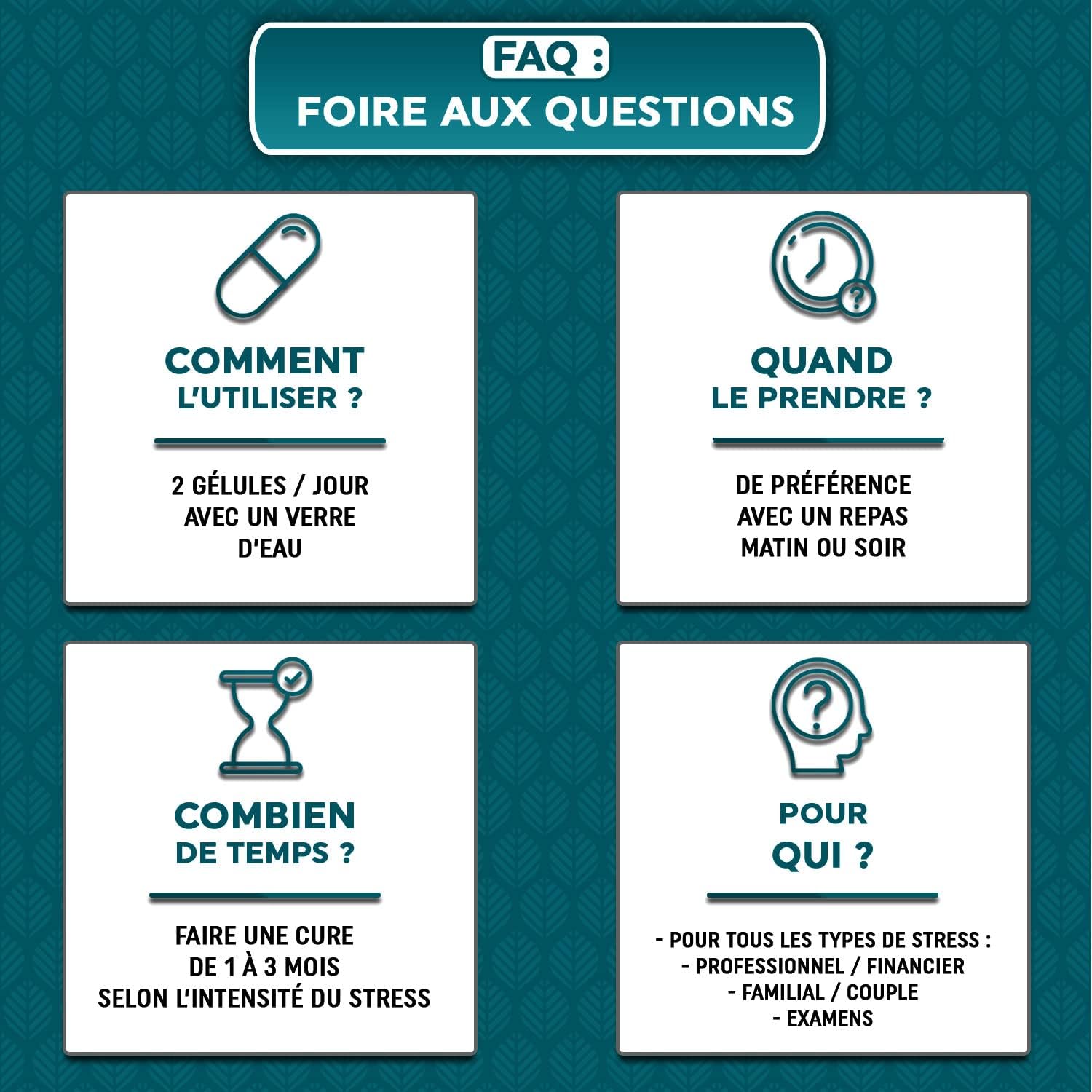 – 1 gélule le matin et 1 le midi : idéal pour réduire le stress au travail- 2 gélules le soir : idéal pour favoriser le sommeil- 1 gélule le matin et 1 le soir : idéal pour une action en continu