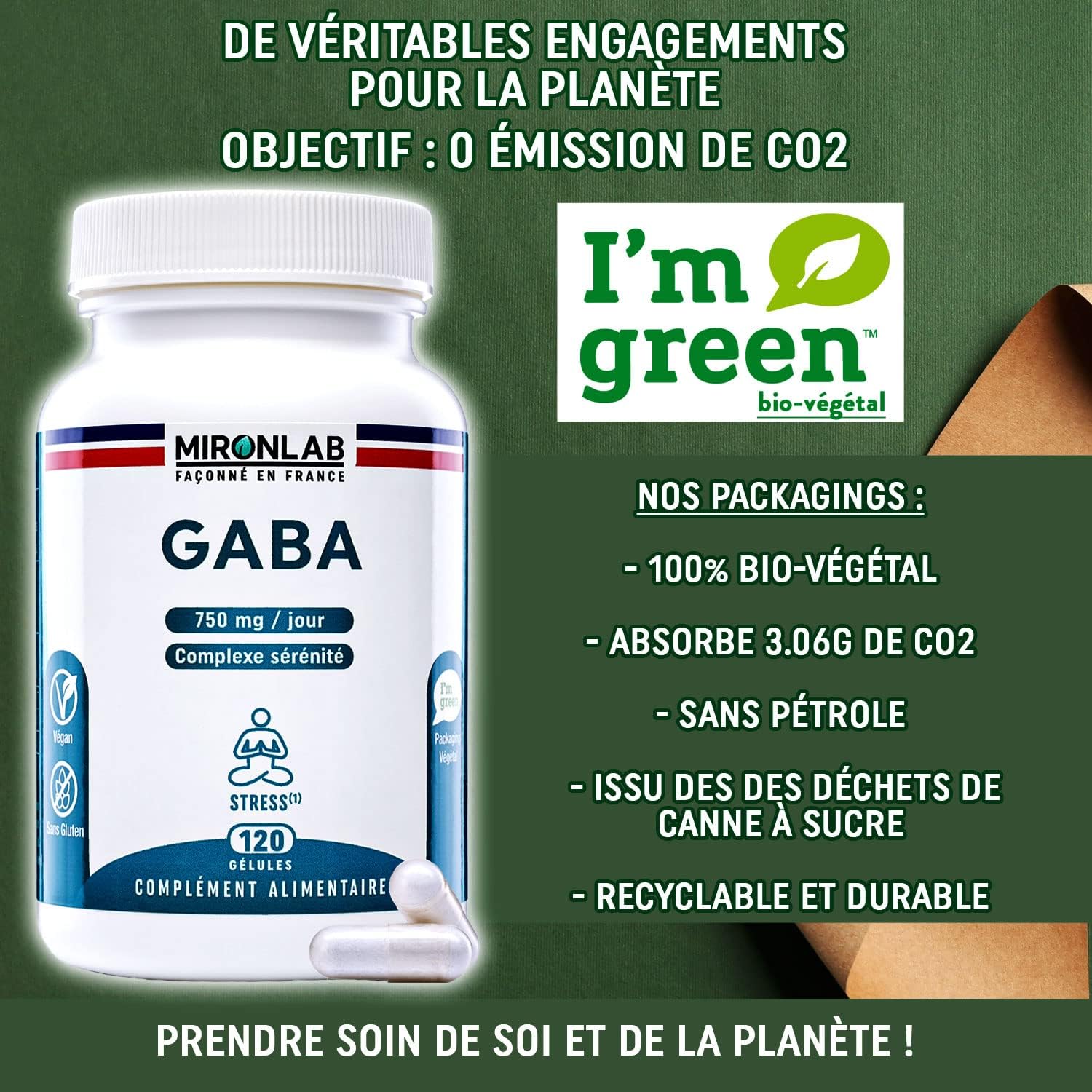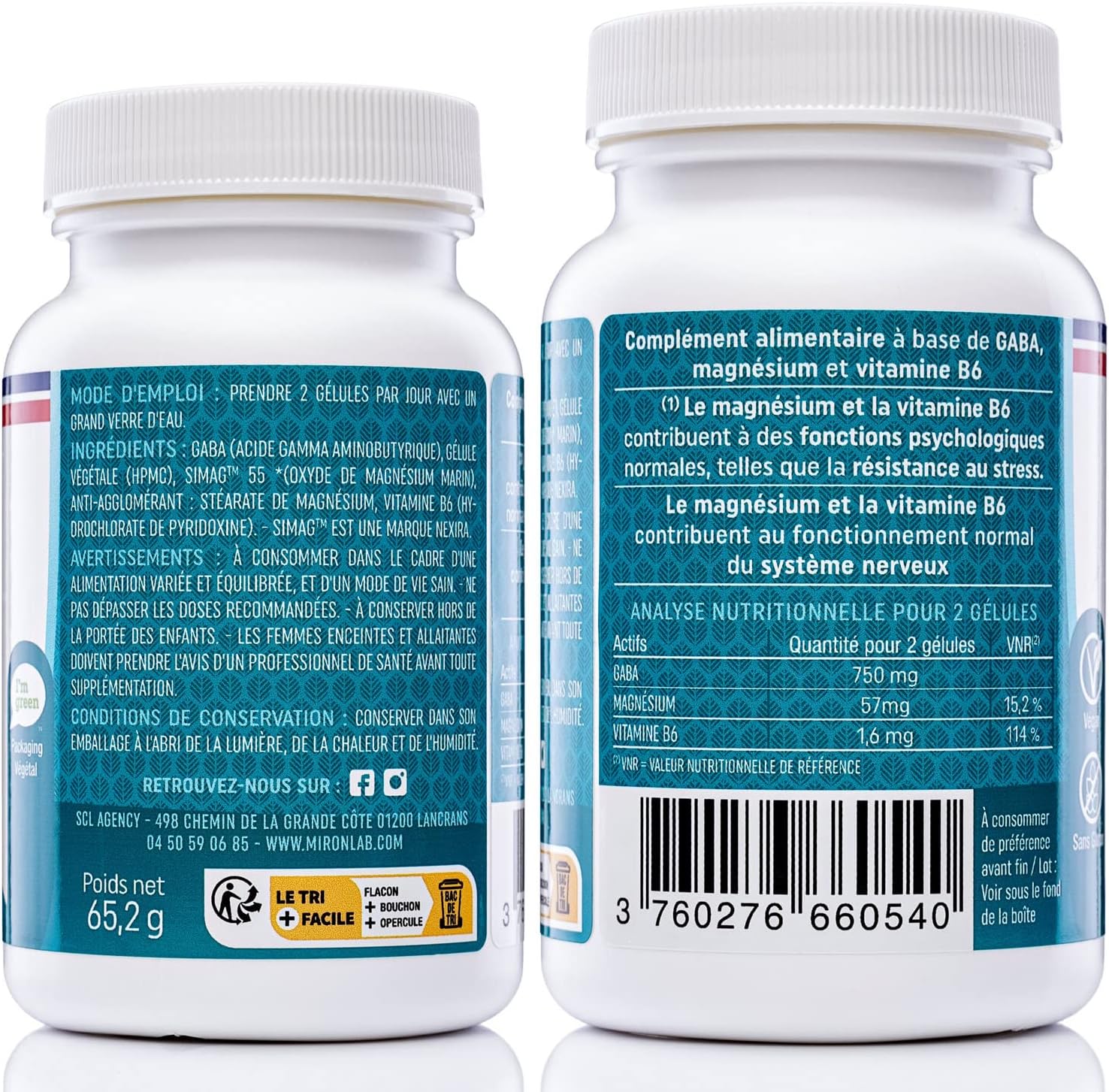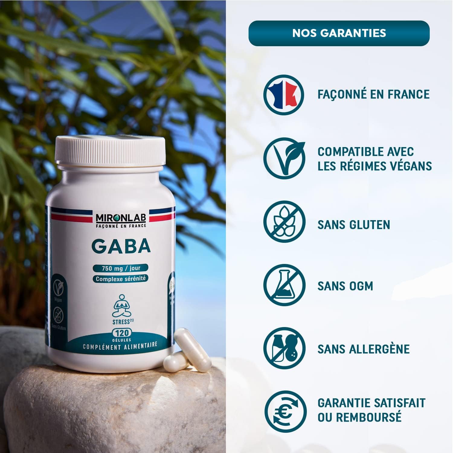 100% NATURAL, PURE AND VEGAN TESTED FOOD SUPPLEMENT ●● Gaba MironLab is GMO free, additive free, pesticide free, gluten free and allergen-free. The capsules are vegetable and therefore ideal for a vegetarian or vegan diet. (Analysis reports on request). Each raw material is selected from our partners and fully traceable. All shaped in Saint Georges les Bains in Ardèche