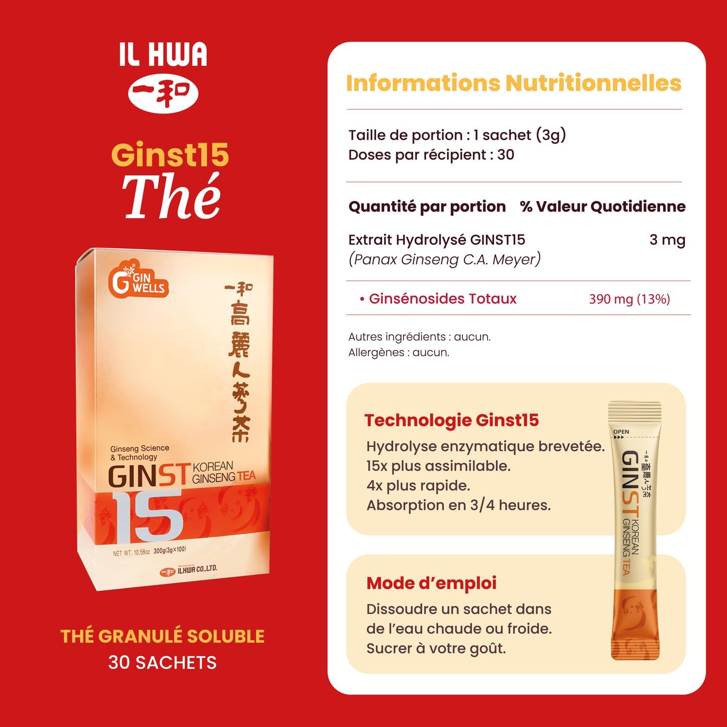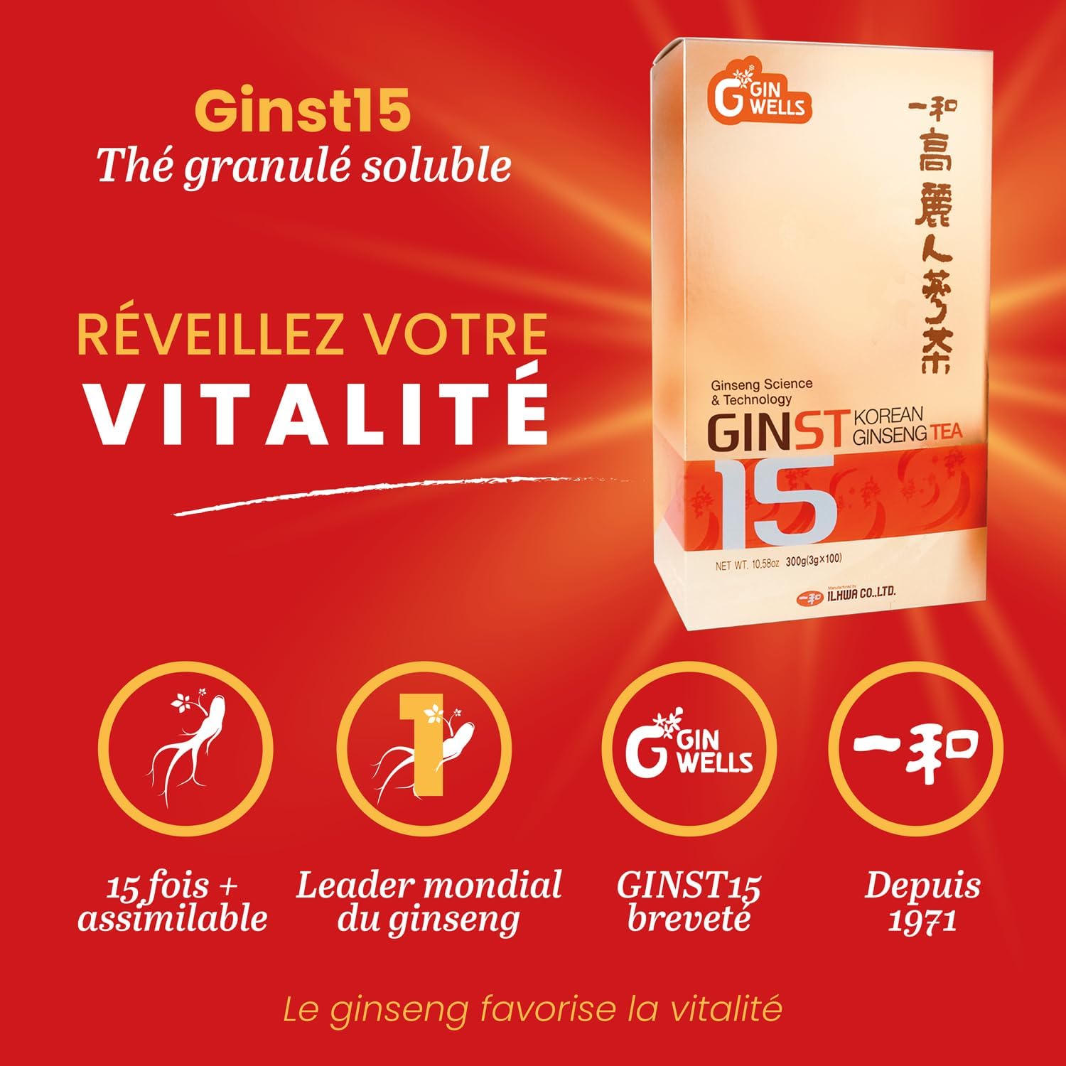 Dstgrhh Experience the power of Ginseng with our GINST15 Ilhwa Ginseng Tea. Formulated from hydrolyzed Korean Ginseng IL HWA whole root extract, it is easy to dissolve in hot or cold water for a tasty and beneficial drink