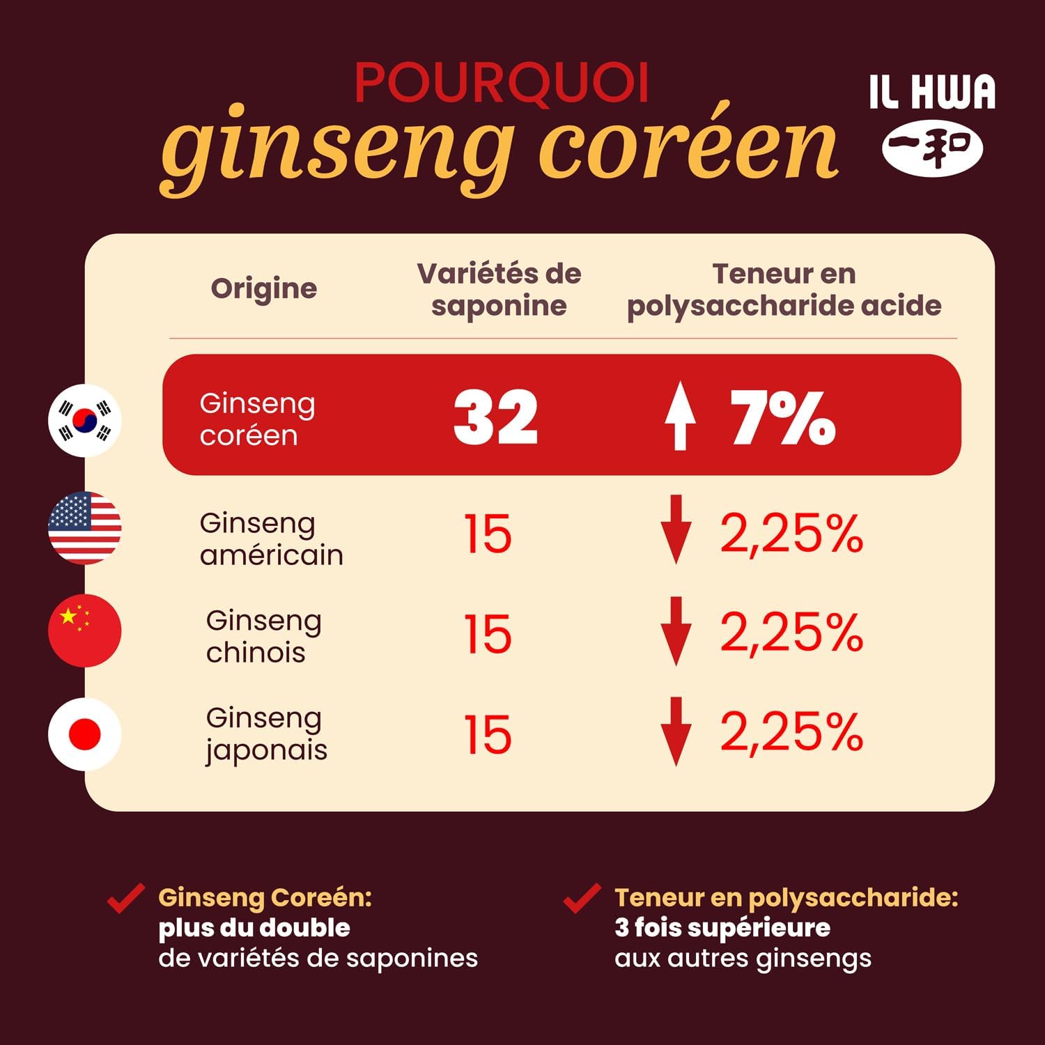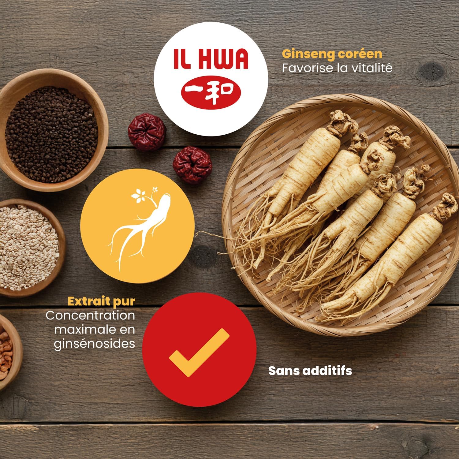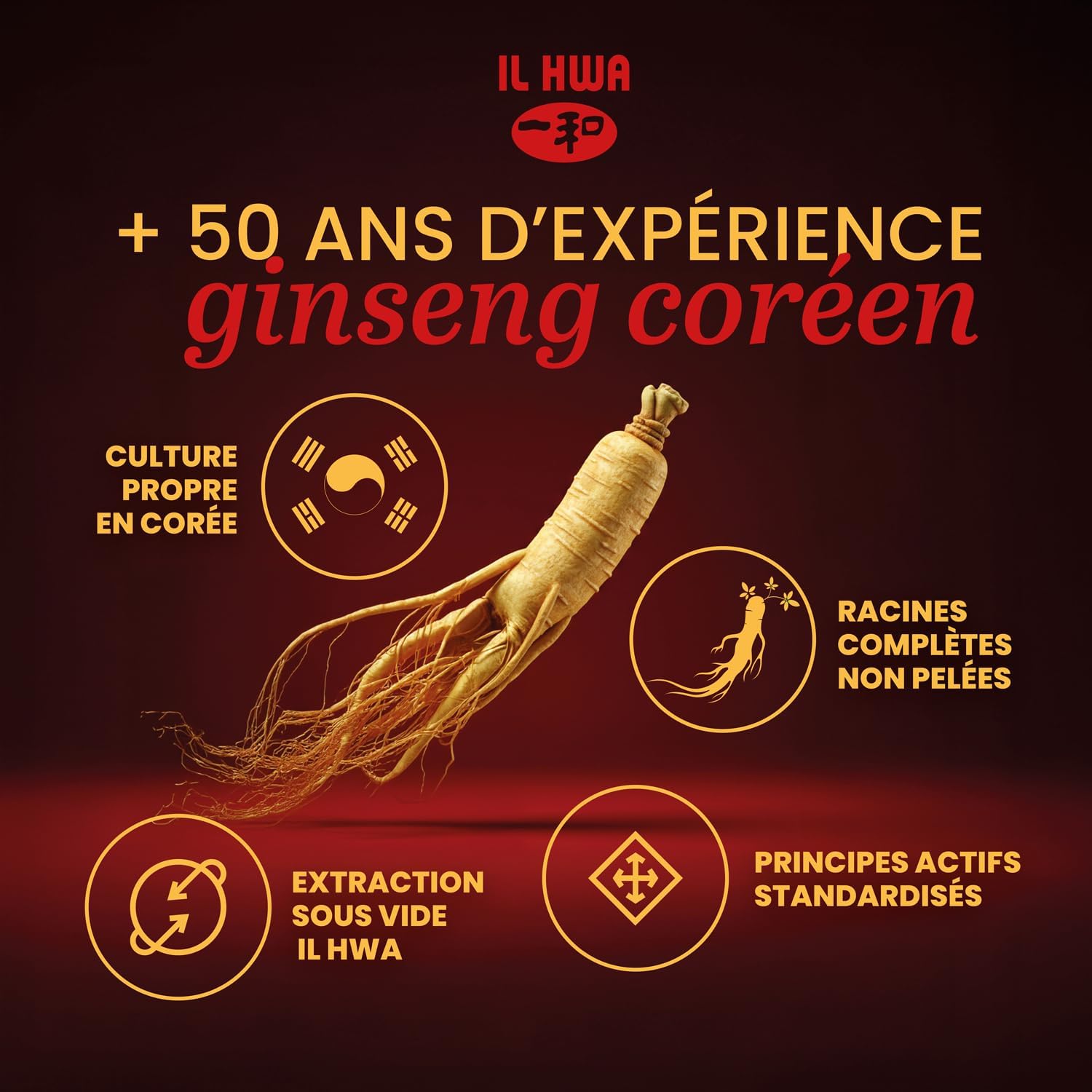The unique GINST15 process, patented by IL Hwa, makes it possible to obtain an extract 15 times more absorbable and 4 times faster. We use 6-year-old roots without peeling, since peeling removes the secondary roots where the active ingredients are located. This method ensures the balanced supply of active ingredients.
