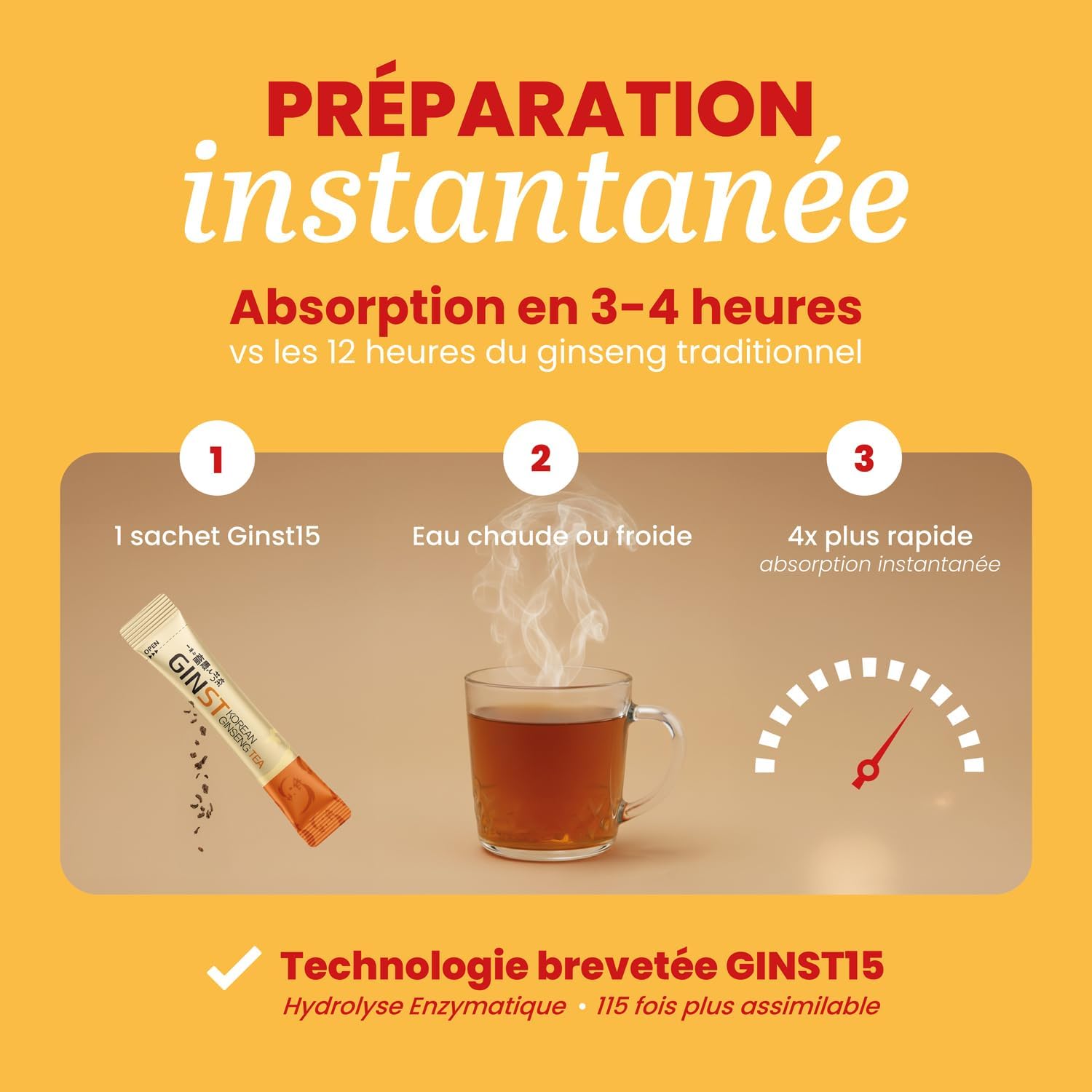 Thanks to our patented GINST15 enzymatic hydrolysis process, our ginseng tea is 15 times more assimilable and 4 times faster to act than other products on the market. Enjoy the benefits of ginseng in no time