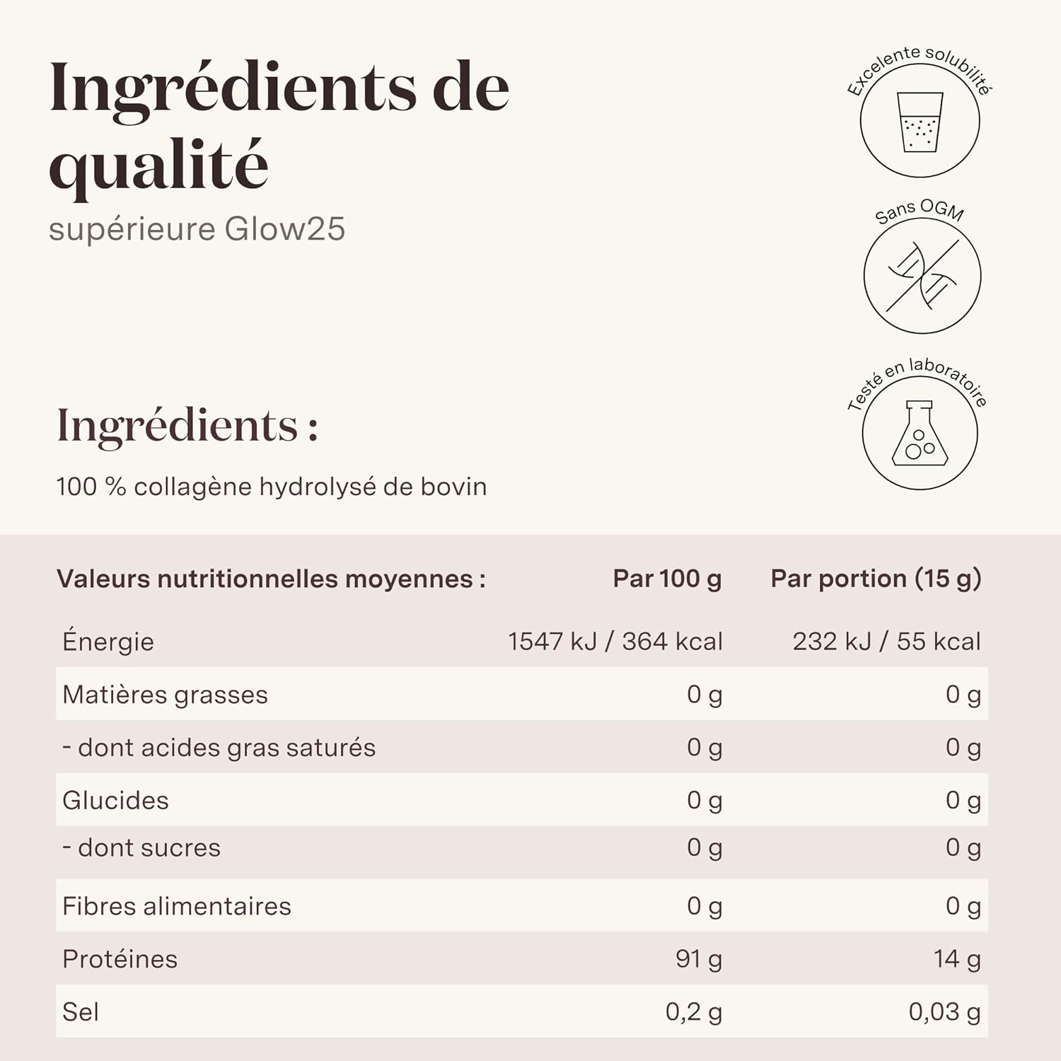 REDUCED PEPTIDE SIZE – Glow25 contains hydrolyzed collagen, composed of low molecular weight peptides obtained by enzymatic hydrolysis.