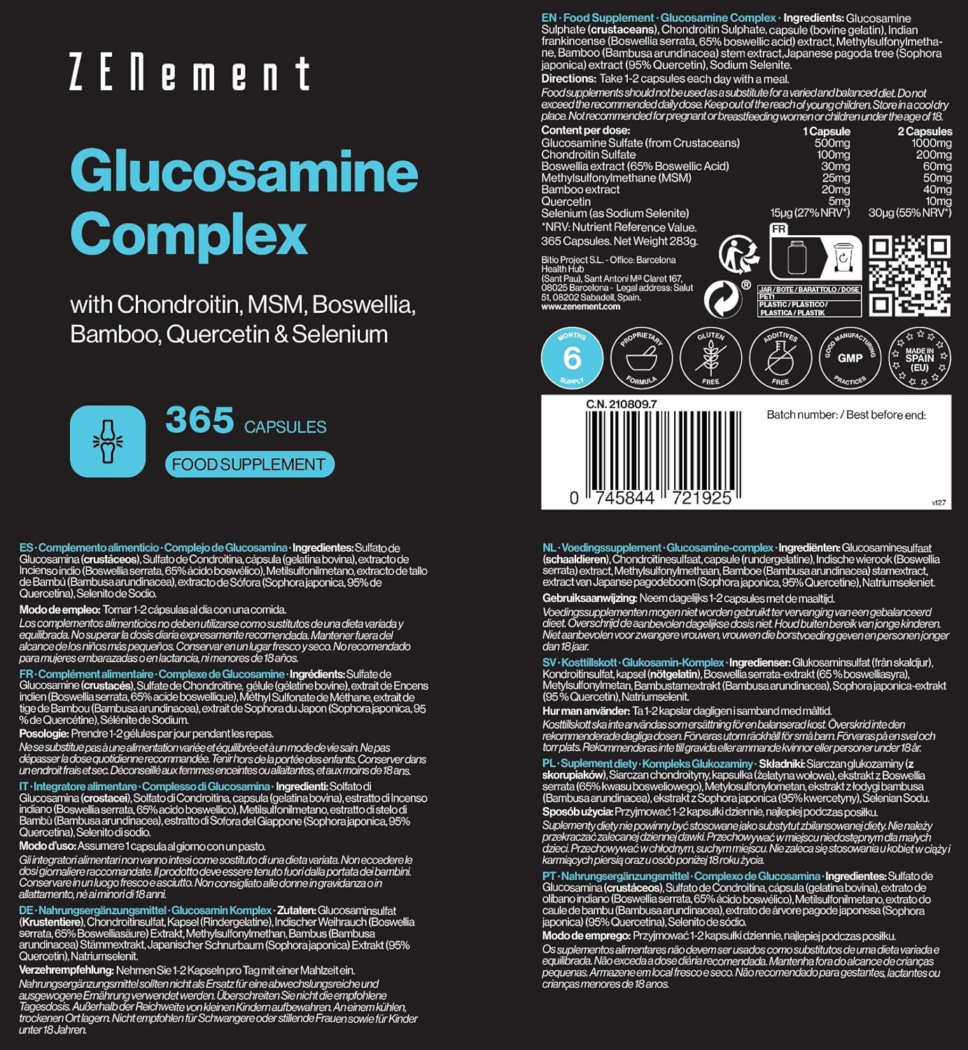 Glucosamine Complex with Chondroitin, MSM, Boswellia, Bamboo, Quercetin and Selenium – 365 Capsules, 6 Month Cure, Capsule Formula – No Additives, No GMO – Zenement