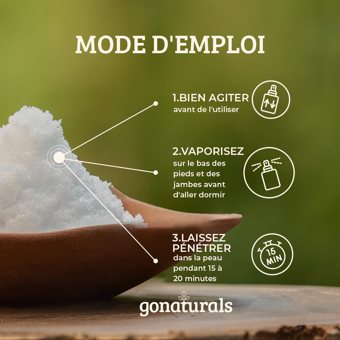 Instructions for use: shake the bottle well before each use. Then spray the magnesium oil on the targeted areas of your body. Whether it’s your facial skin, hair, scalp, nails, noxious cramps or sore muscles, this versatile spray will help you feel more relaxed and revitalized. Use it daily for optimal results.