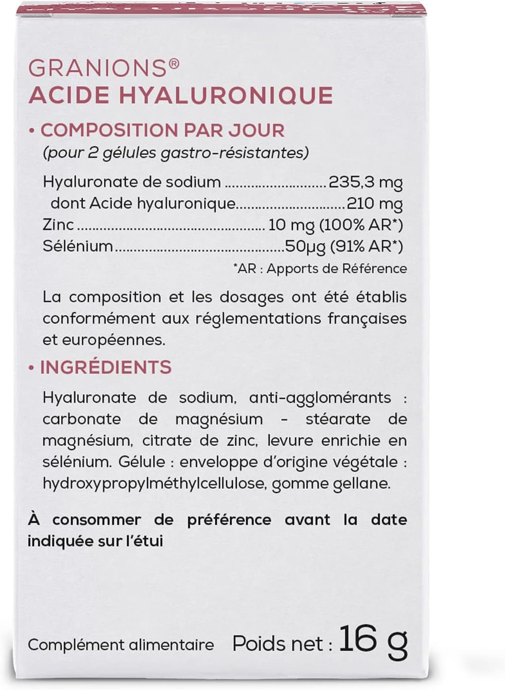 Discover our anti-aging food supplement, Hyaluronic Acid 60 capsules (pure hyaluronic acid), a powerful food supplement for the skin. Specially formulated to take care of your skin from the inside, GRANIONS Hyaluronic Acid 210 mg is the key to an effective anti-aging treatment. Enriched with pure hyaluronic acid, this GRANIONS food supplement is designed to deeply nourish and revitalize your skin. Thanks to their targeted action, hyaluronic acid capsules help reduce visible signs of aging, such as fine lines and wrinkles, while improving skin elasticity and firmness. Zinc and selenium added to the formula strengthen the skin barrier and protect against oxidative damage. This skin supplement is a practical and effective solution to integrate hyaluronic acid into your daily care routine. These hyaluronic acid capsules are easy to take, allowing you to enjoy the benefits of hyaluronic acid without the extra effort. Treat yourself to the nutrients it needs with our skin supplement hyaluronic acid capsules and two oligo elements (Zinc and Selenium). Make this anti-aging cure your ally for radiant, smoother and visibly younger skin.