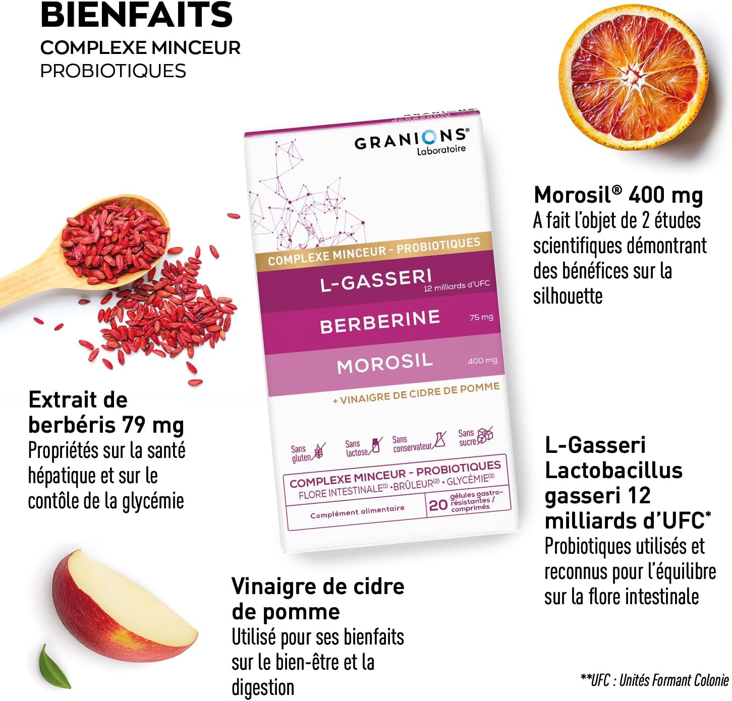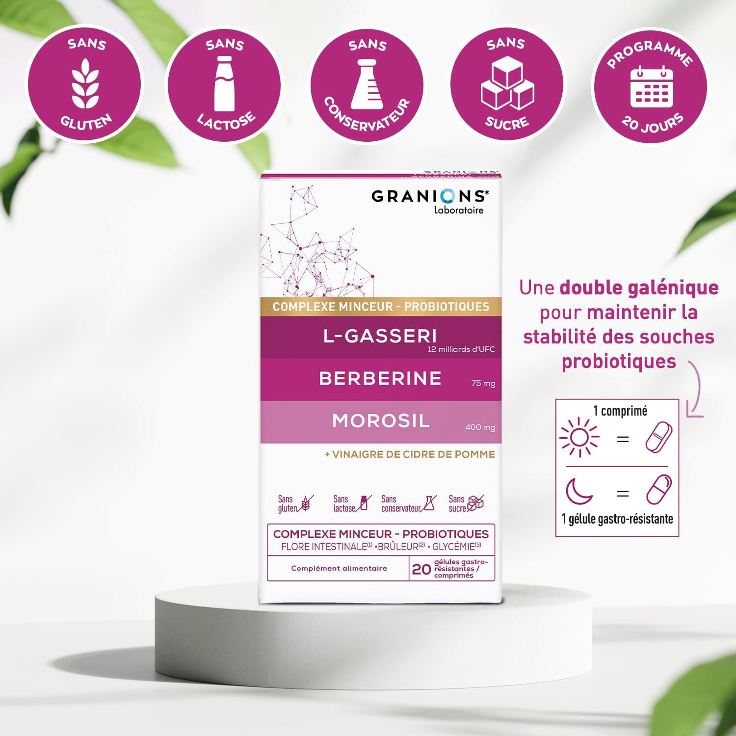 Discover Granions Probiotic Flora Intestinal Slimming Complex, an innovative food supplement formulated to promote weight loss and extra strength weight loss while effectively balancing your gut microbiota. Thanks to a gastro-resistant capsule containing 12 billion CFUs of Lactobacillus Gasseri, a recognized probiotic intestinal flora, and a tablet concentrated in morosil, berberine, weight loss apple cider vinegar and chromium, this powerful weight loss fat burner acts deeply. Our probiotic gut flora slimming complex supports digestion, improves nutrient uptake, reduces cravings and limits fat storage to help lose belly. The combination of morosil and apple cider vinegar, coupled with berberine and chromium, naturally stimulates weight loss and regulates blood sugar. This probiotic food supplement promotes a flat stomach and acts as a powerful fat burner for fast and effective weight loss. Our slimming complex, containing morosil and apple cider vinegar weight loss, is also formulated gluten-free, sugar-free, lactose free and preservatives. The probiotic intestinal flora contained in each dose helps improve your gut flora while acting as an effective fat burner. Thanks to the combined action of morosil apple cider vinegar, l gasseri probiotic, chromium, the Granions Slimming Complex supports your goal of fast and effective weight loss and improves your overall well-being. The slimming probiotic complex is ideal for losing weight quickly and effectively and for losing weight quickly effectively. The Granions slimming complex is ideal for those looking for a natural and efficient solution for the gut microbiota, digestion and blood glucose regulation with a visible flat stomach effect.