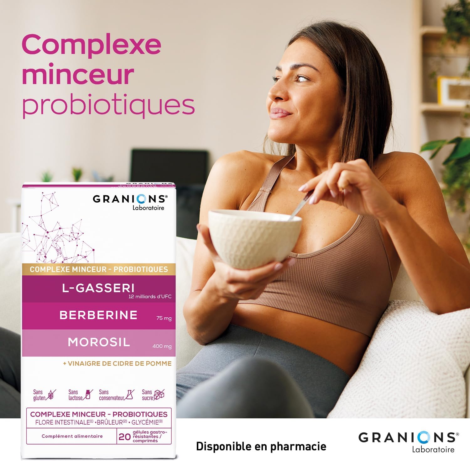 PROBIOTIC INTESTINAL FLORA | Granions Probiotic Slimming Complex is formulated with 12 Billion CFU of lactobacillus gasseri (L Gasseri) probiotic. This complex slimming probiotic intestinal flora enriches the intestinal microbiota to ensure effective weight loss, nutrient assimilation and limit fat storage. This probiotic has an effect on satiety, to promote weight loss and have a flat stomach.